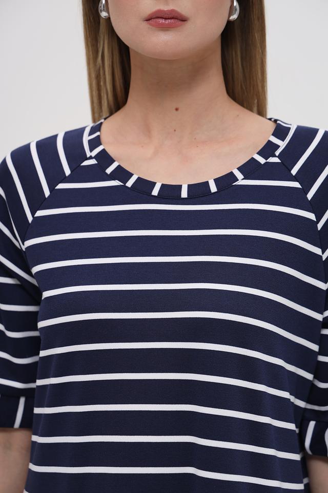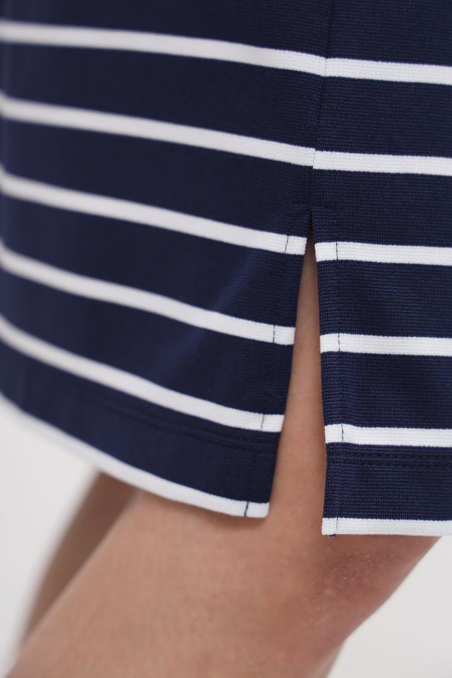 Это платье от Lecomte выполнено в классическом стиле с использованием горизонтальной полоски. Основной цвет – тёмно-синий, который гармонично сочетается с белыми полосами, создавая свежий и элегантный образ.