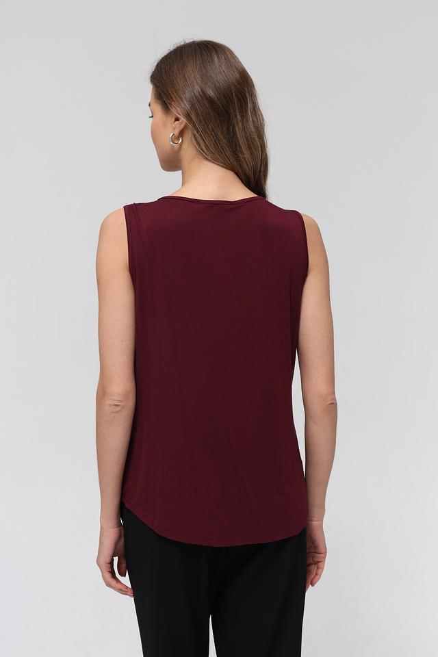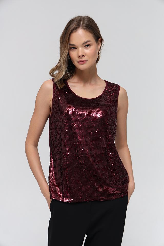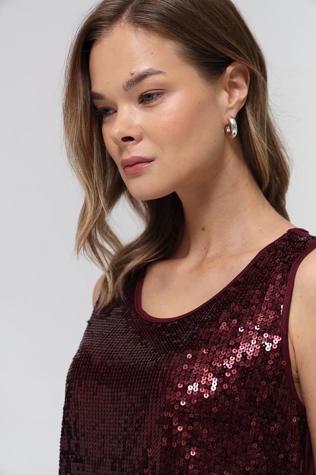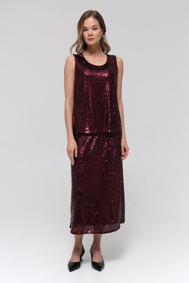 Модель полностью покрыта мерцающими пайетками бордового оттенка, что придает ей праздничный и нарядный вид. Округлый вырез горловины и отсутствие рукавов делают силуэт легким и женственным.