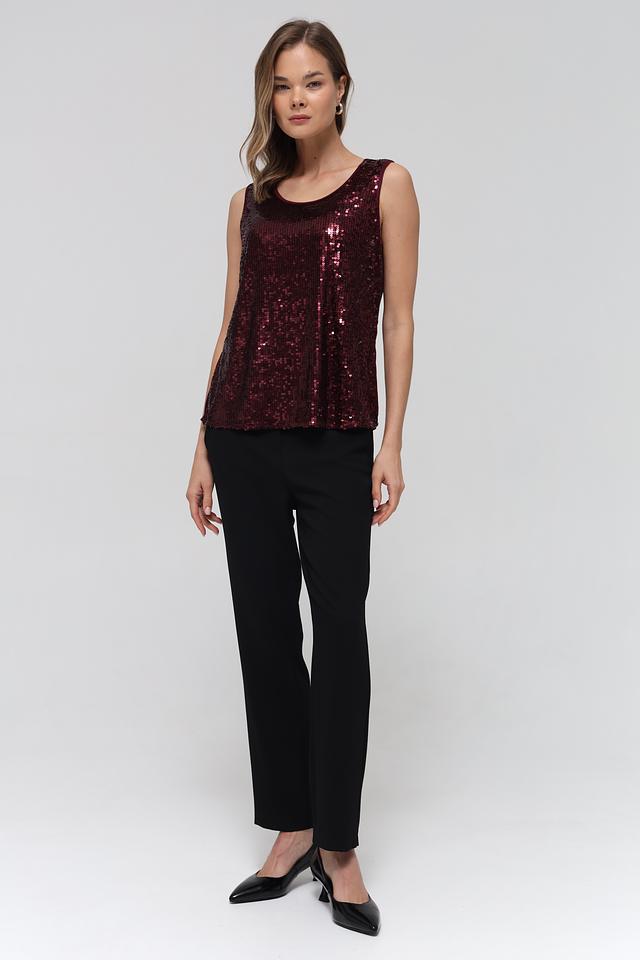 Бордовый топ Lecomte, выполненный из полиэстера с добавлением эластана, полностью покрыт сверкающими пайетками. Модель без рукавов с округлым вырезом горловины станет ярким акцентом вашего образа. Состав: полиэстер 95%, эластан 5%