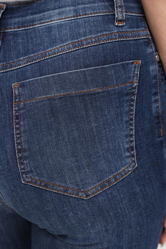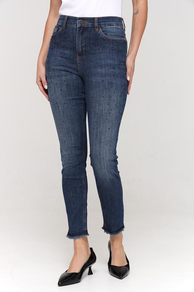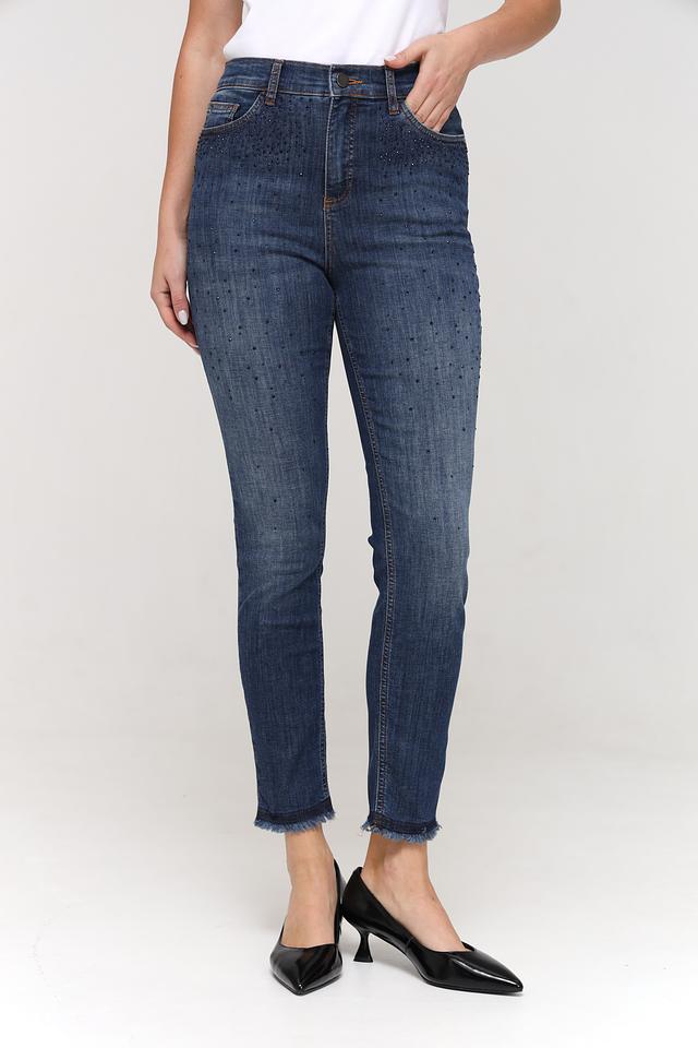 Джинсы имеют классический синий цвет и высокую посадку, подчеркивающую талию. Оригинальным акцентом является декор из страз, расположенный на передней части брюк, что придает им изысканный вид.