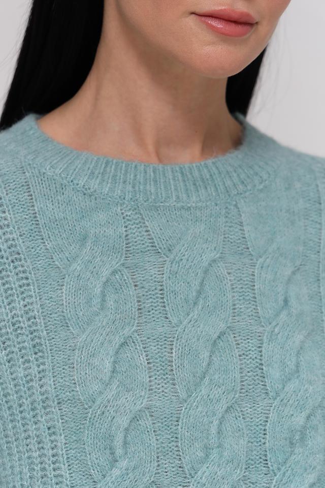 Пуловер имеет приятный мятный цвет и украшен рельефным узором из кос, который придает ему оригинальность и текстуру. Круглый вырез горловины и рукава 3/4 делают его универсальным для различных стилей и образов.