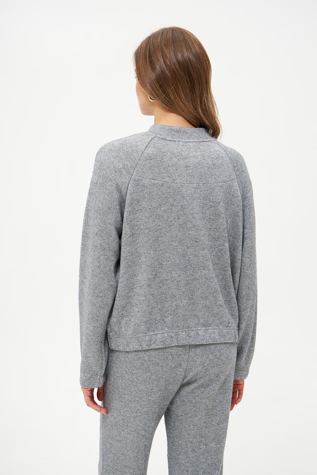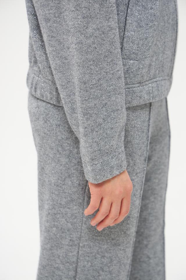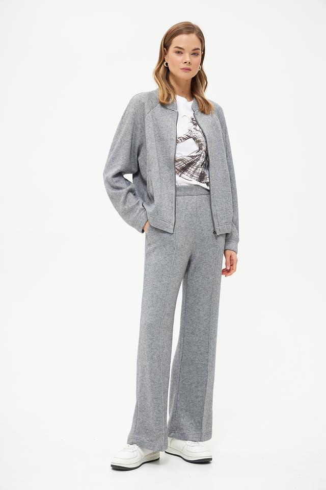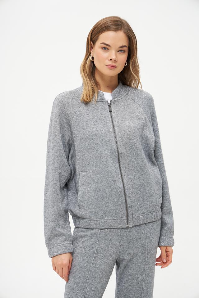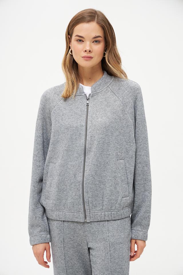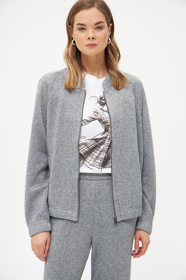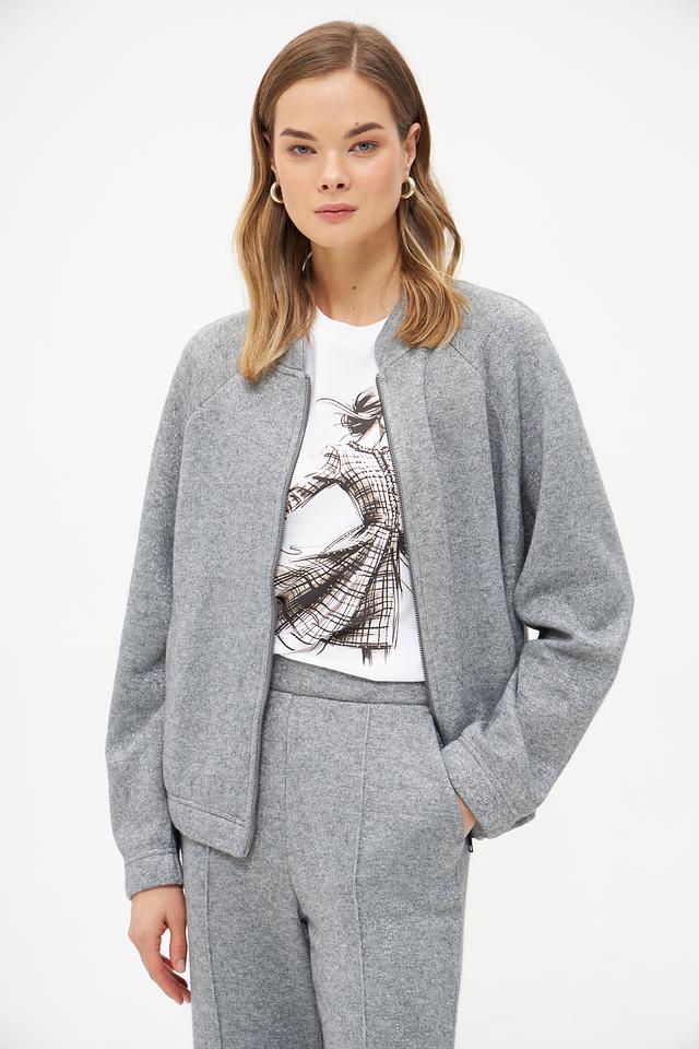 Жакет застегивается на молнию, что делает его удобным в использовании. Модель имеет воротник-стойку и длинные рукава. Состав ткани включает полиэстер, вискозу, полиамид и метализированную нить, благодаря чему жакет обладает приятной текстурой и легким блеском.