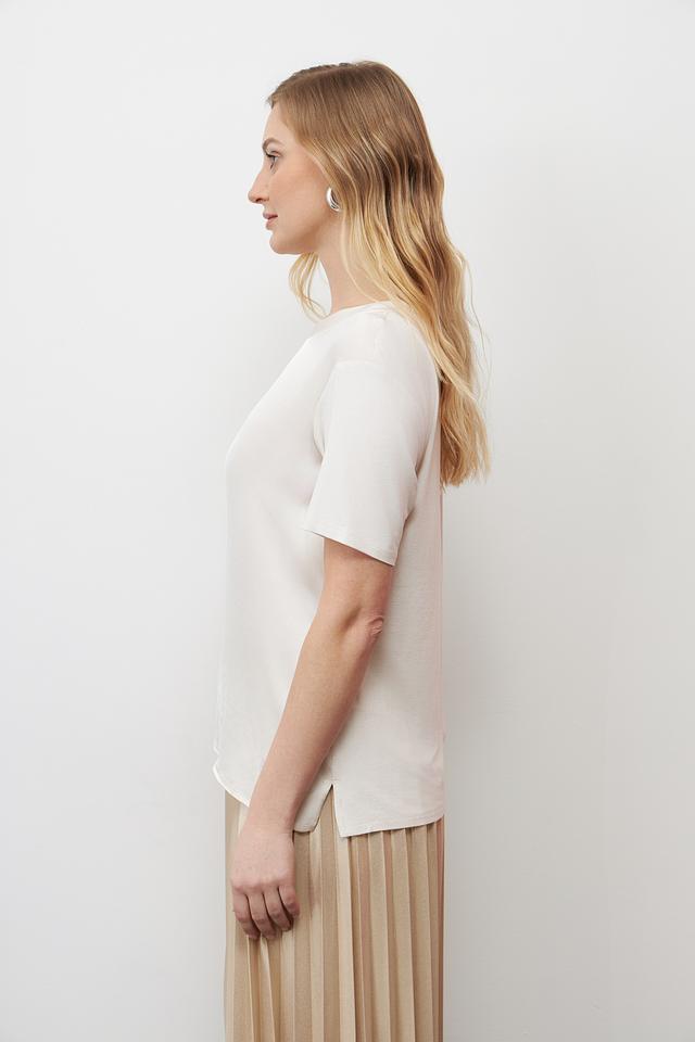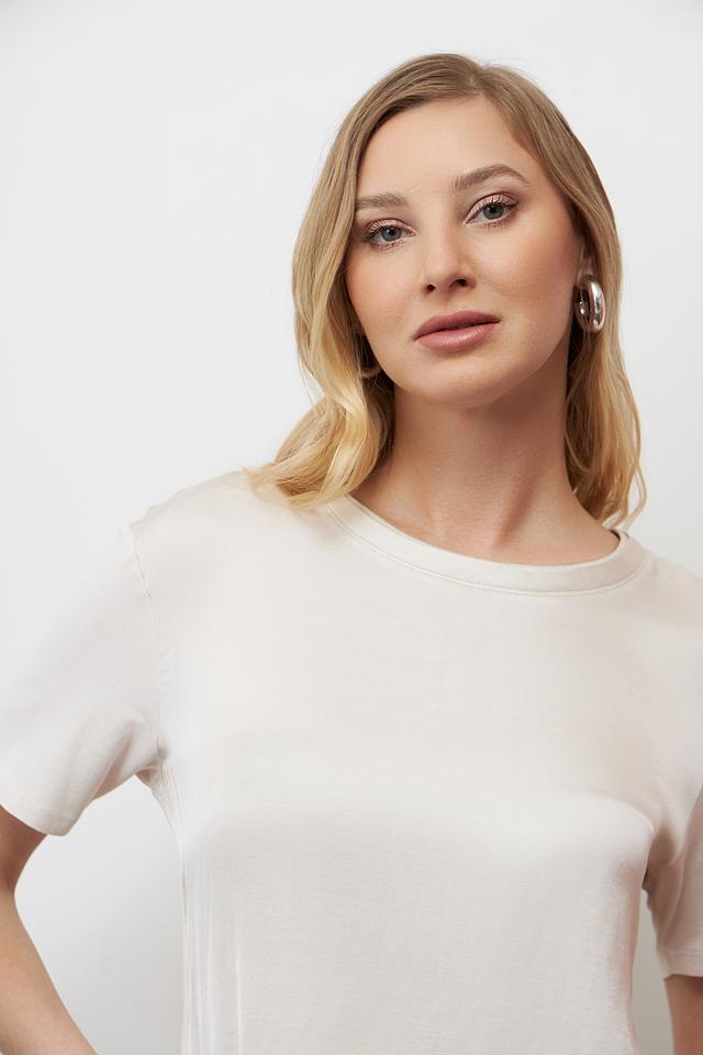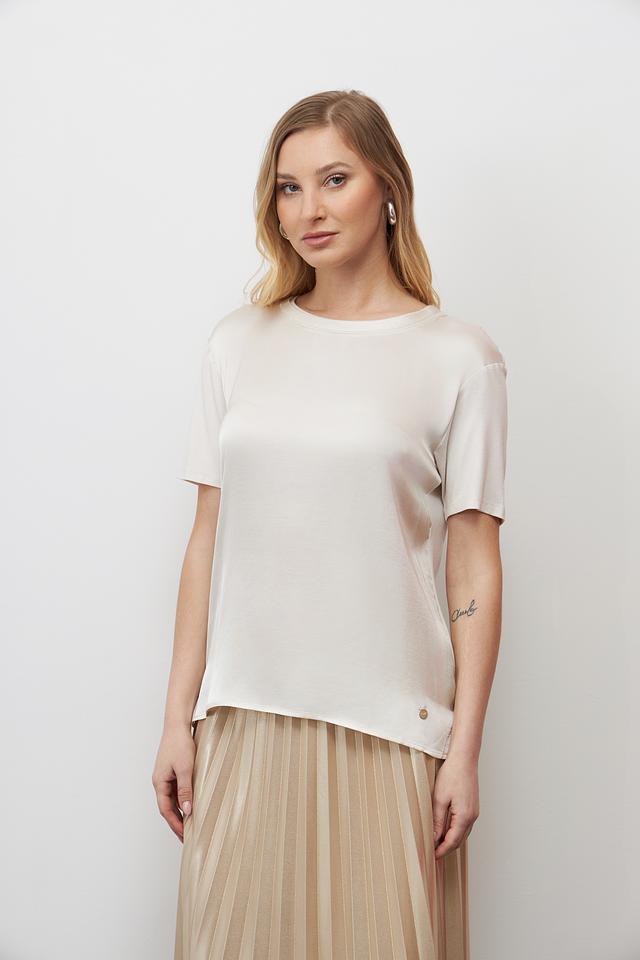 Блуза имеет классический крой с короткими рукавами и круглым вырезом горловины. Она идеально подходит для создания повседневных и офисных образов. Благодаря своему лаконичному дизайну, блузу легко сочетать с различными предметами гардероба – от юбок и брюк до джинсов и шорт.