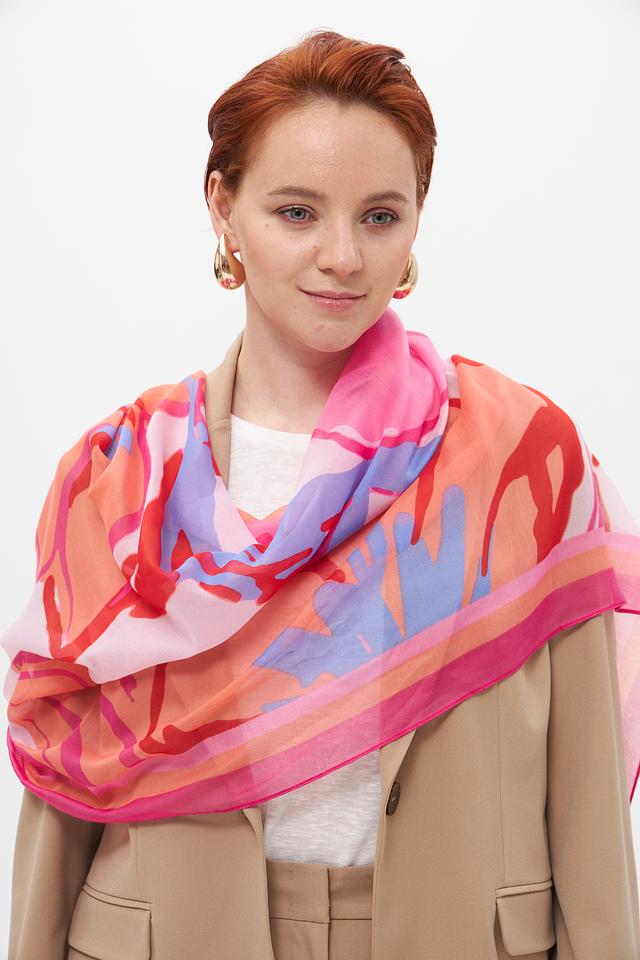 Дизайн шарфа представлен абстрактным рисунком, сочетающим в себе несколько оттенков розового, красного, сиреневого и персикового цветов. Такое сочетание делает шарф универсальным и подходящим для различных стилей одежды.
