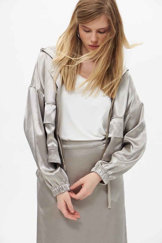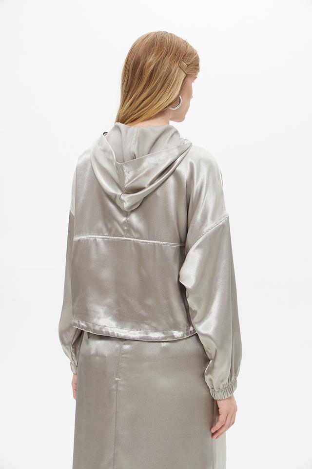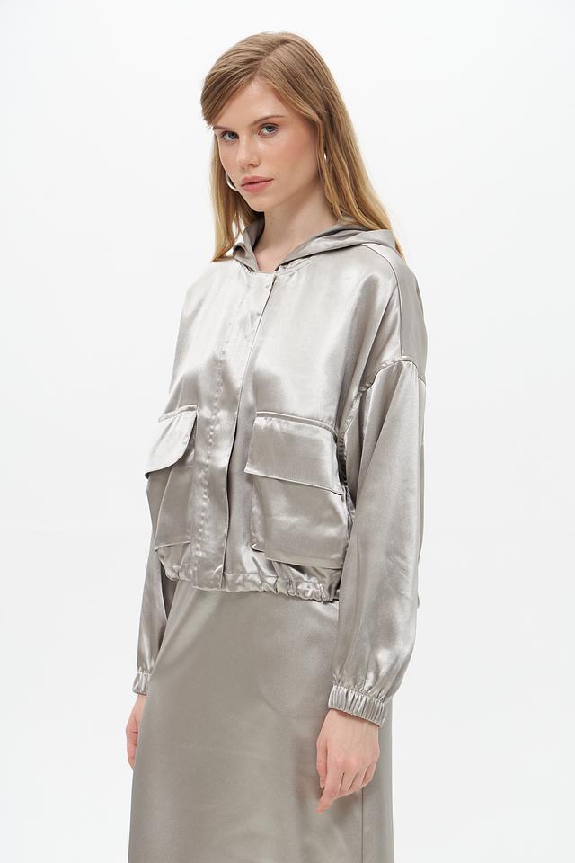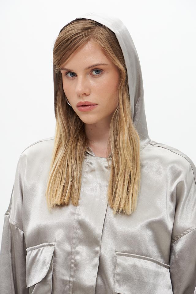 Стильный жакет Lecomte серого цвета выполнен из гладкого атласа. Модель с капюшоном и удобными карманами станет отличным дополнением к вашему образу. Жакет изготовлен из 100% полиэстера. Состав: полиэстер 100%