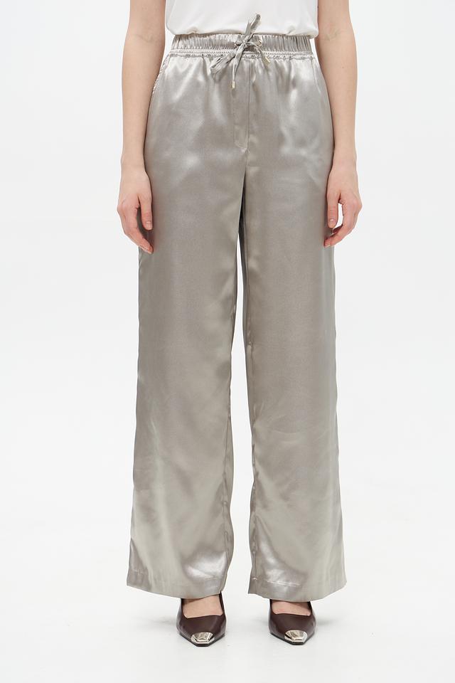 Стильные брюки Lecomte серого цвета из 100% полиэстера. Модель выполнена из гладкой атласной ткани с эластичным поясом и завязками. Идеальный выбор для создания элегантного и комфортного образа. Состав: полиэстер 100%
