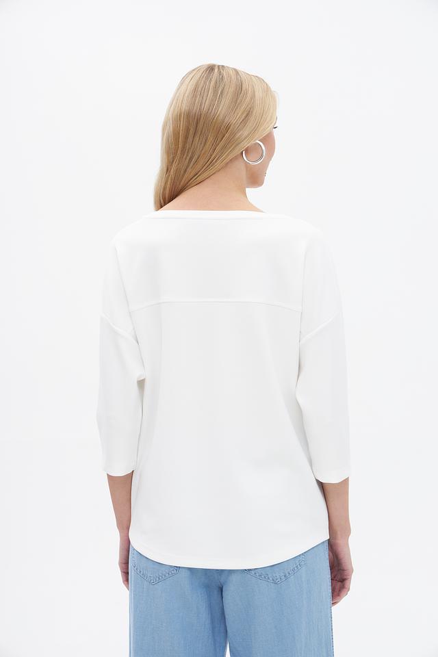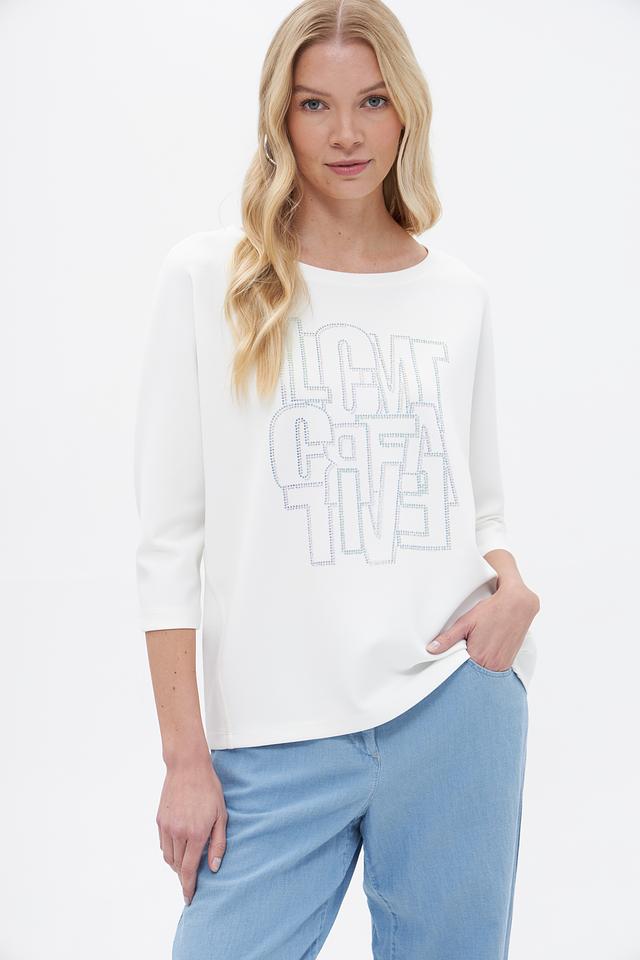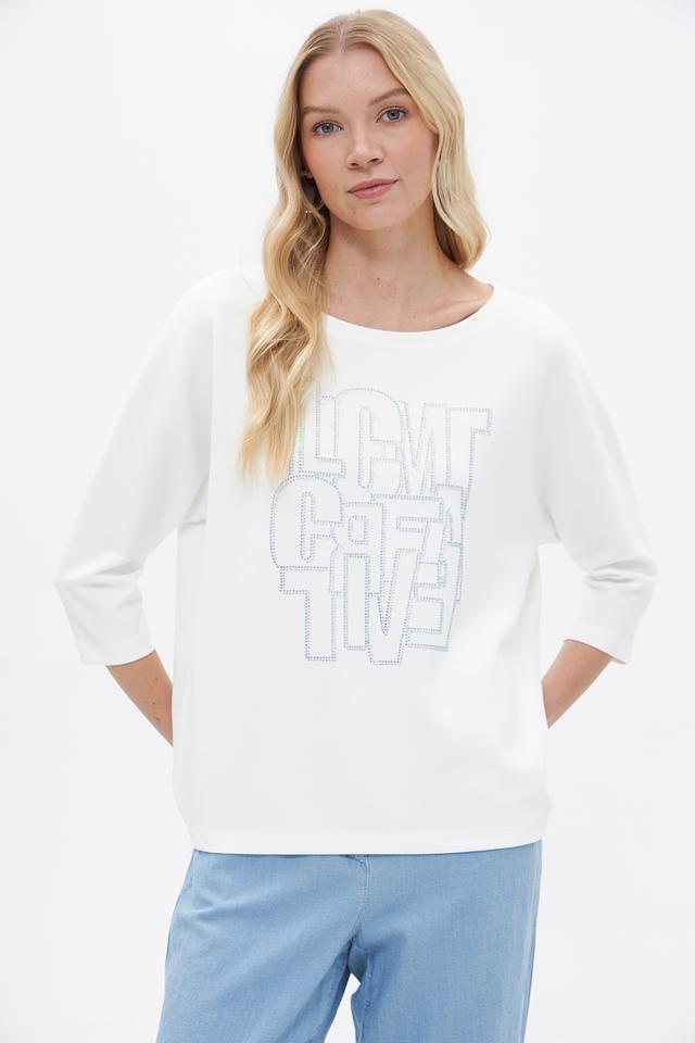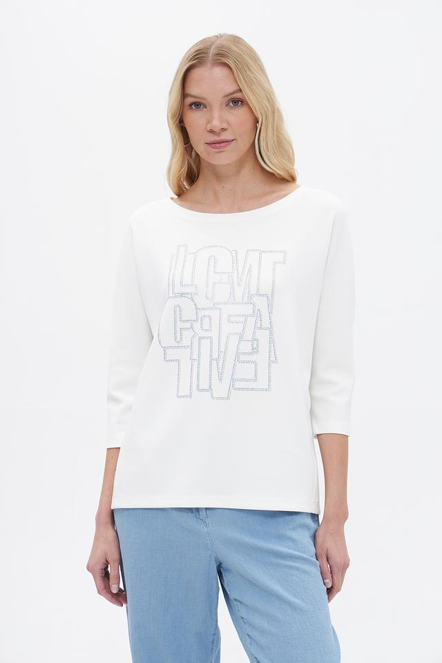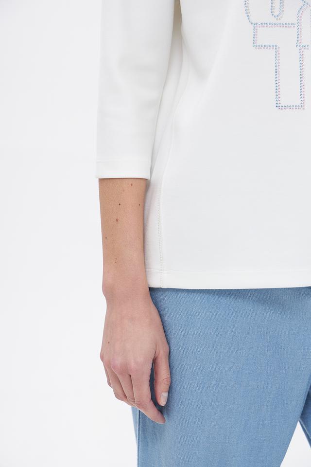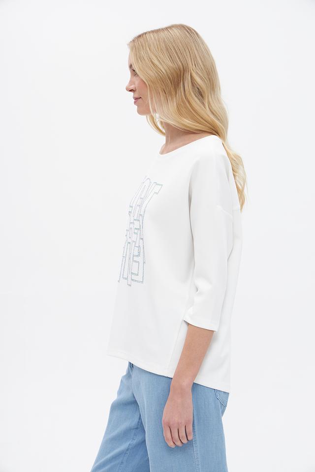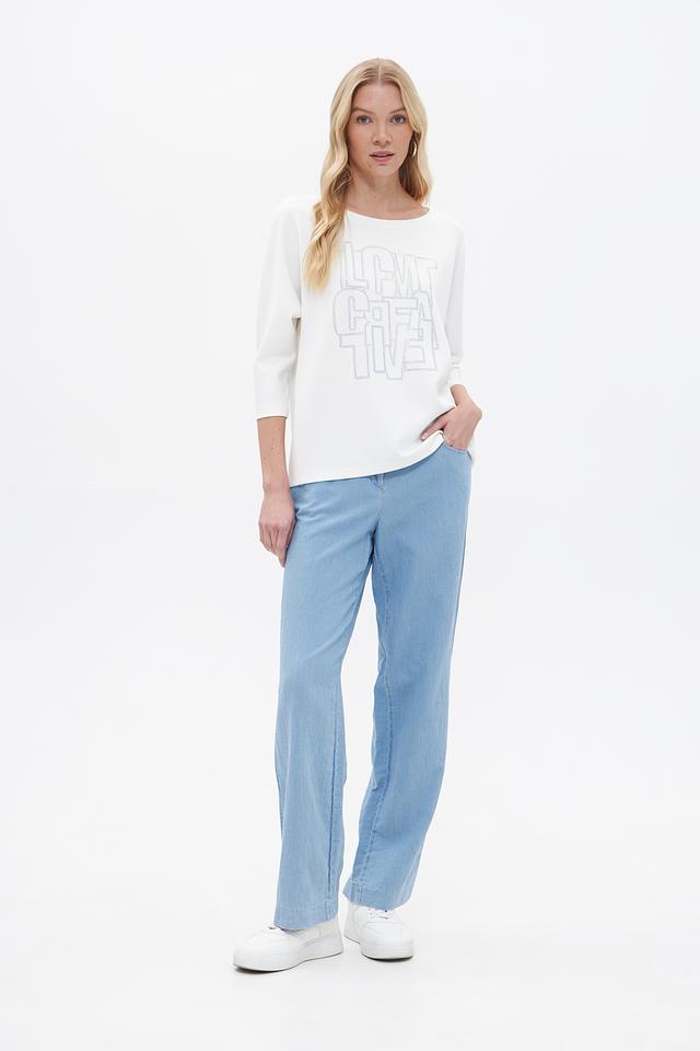 Особый акцент в дизайне пуловера – это оригинальный принт с надписью, выполненный в голубых тонах. Рукава длиной 3/4 делают модель универсальной и подходящей для разных сезонов. Пуловер имеет круглый вырез горловины.