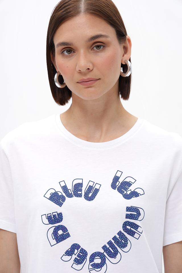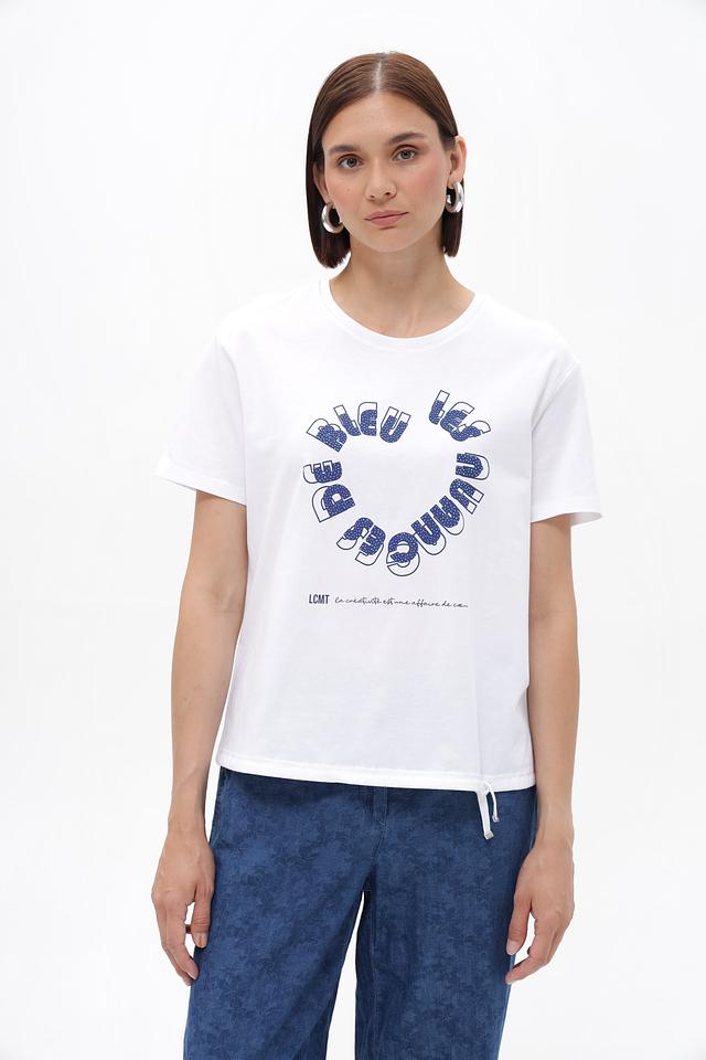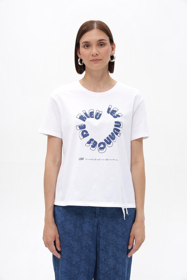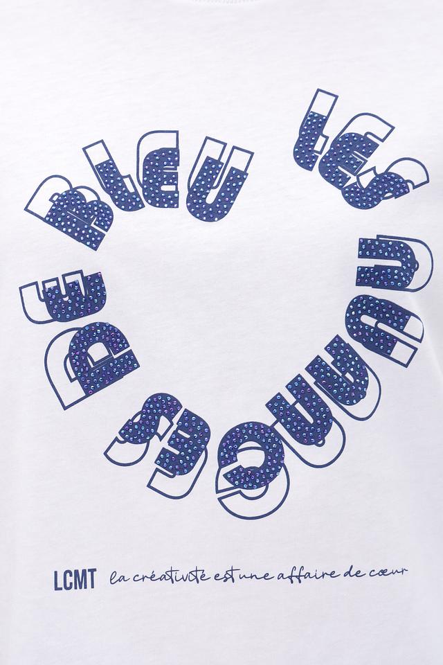Белая футболка Lecomte с оригинальным принтом 'Bleu' в виде круга из надписей. Изготовлена из 100% хлопка, обеспечивающего комфорт в повседневной носке. Стильный и лаконичный дизайн. Состав: хлопок 100%