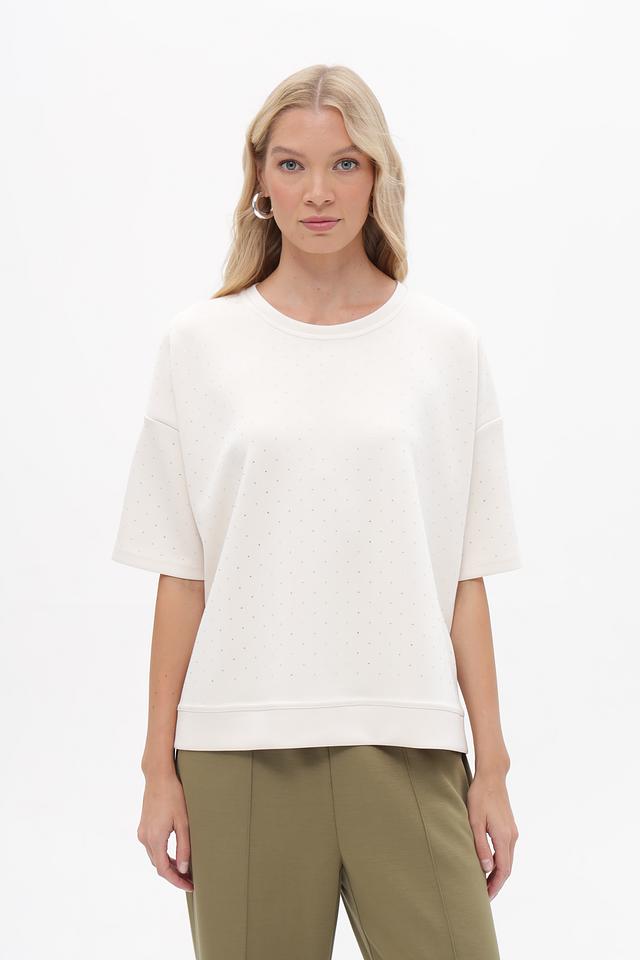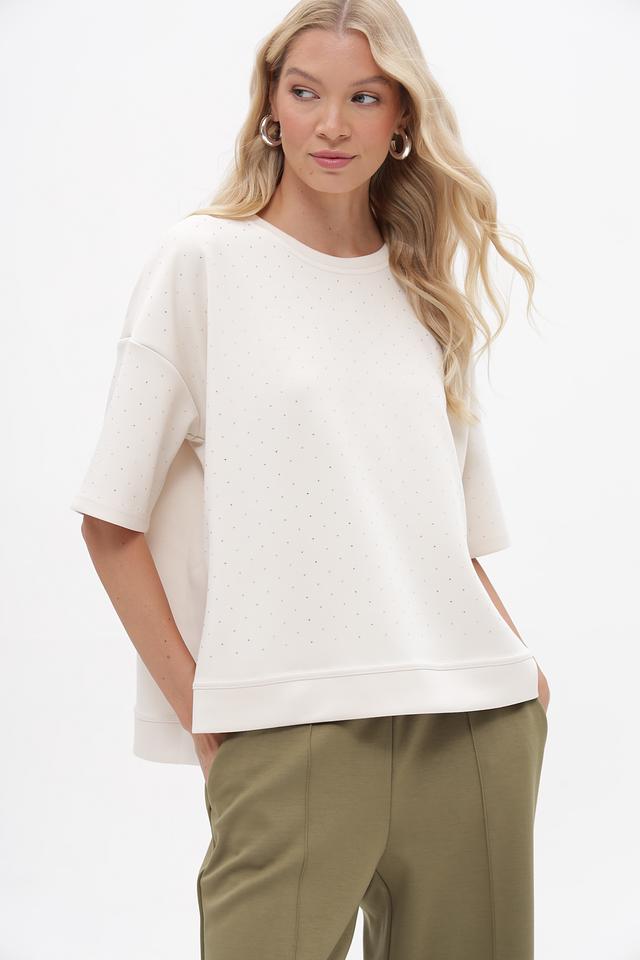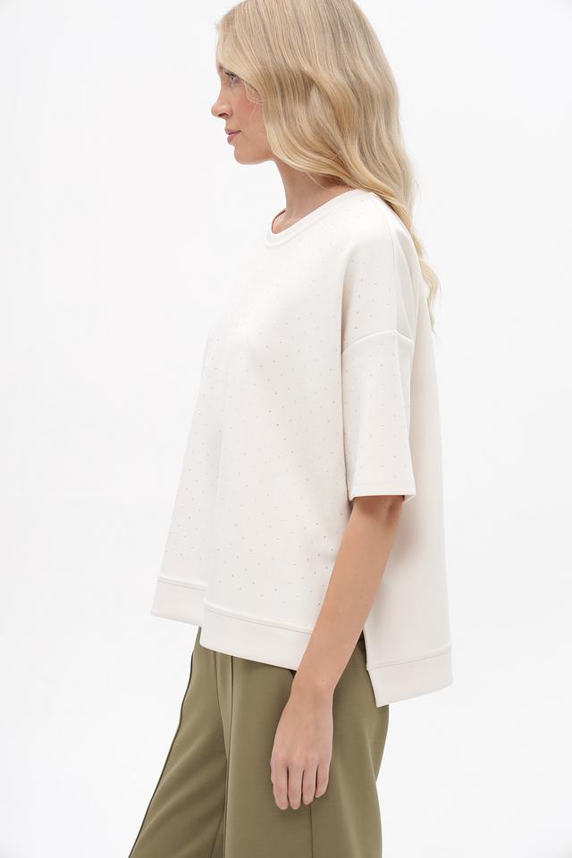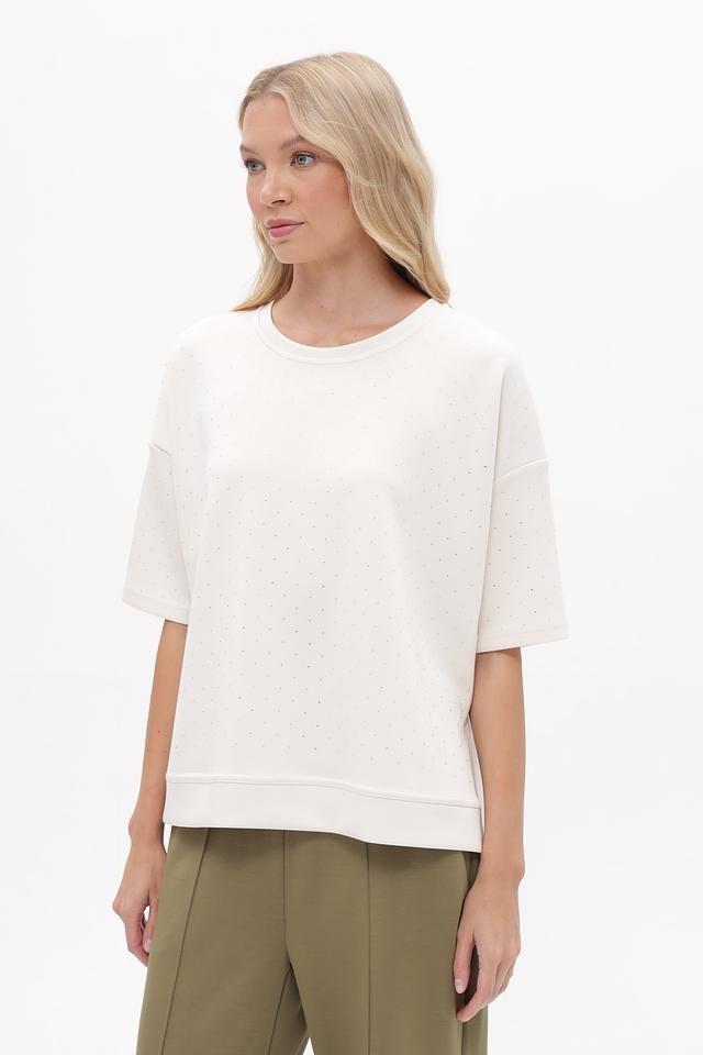 Женская футболка от бренда Lecomte выполнена в белом цвете и имеет свободный, слегка оверсайз крой. Модель украшена мелкой вышивкой в тон ткани, придающей изделию элегантность и изысканность.