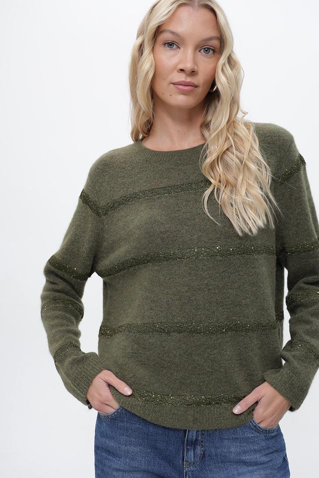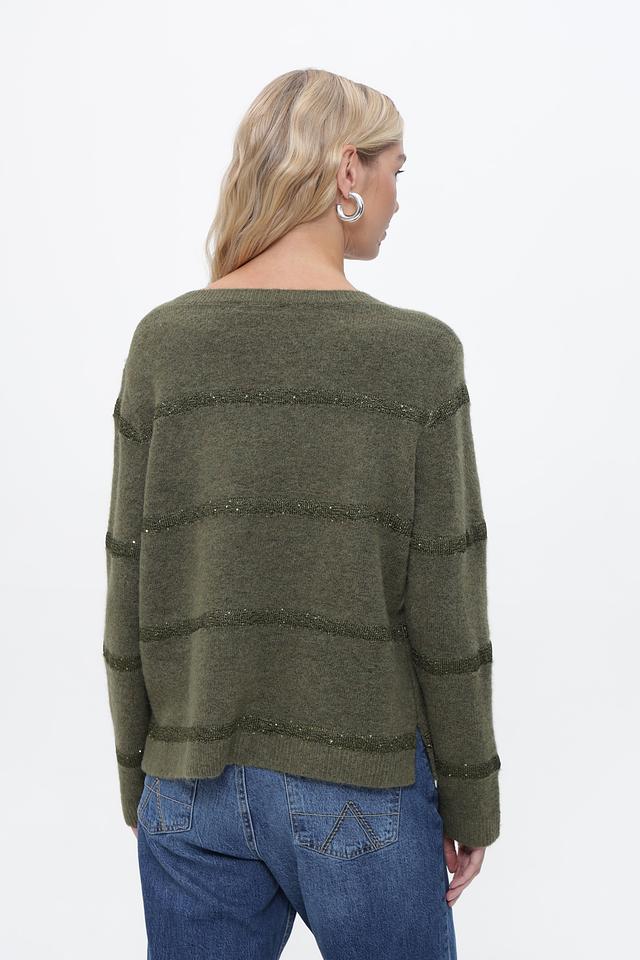 Оливковый цвет пуловера придает ему универсальность, позволяя легко сочетать его с различными элементами гардероба. Декоративные полосы из пайеток добавляют изделию изысканности и привлекают внимание.