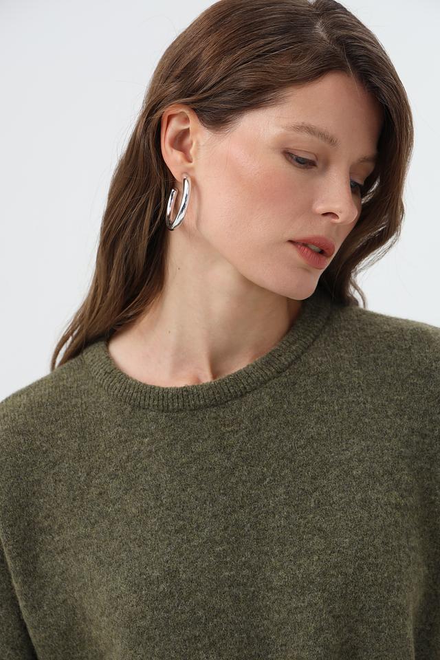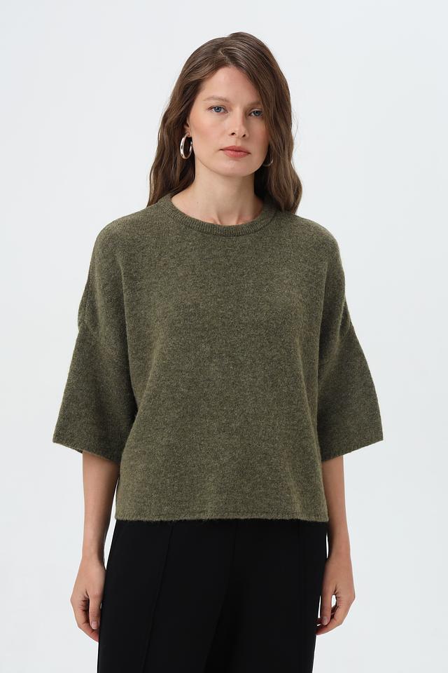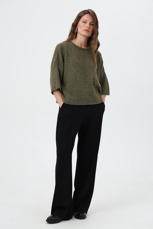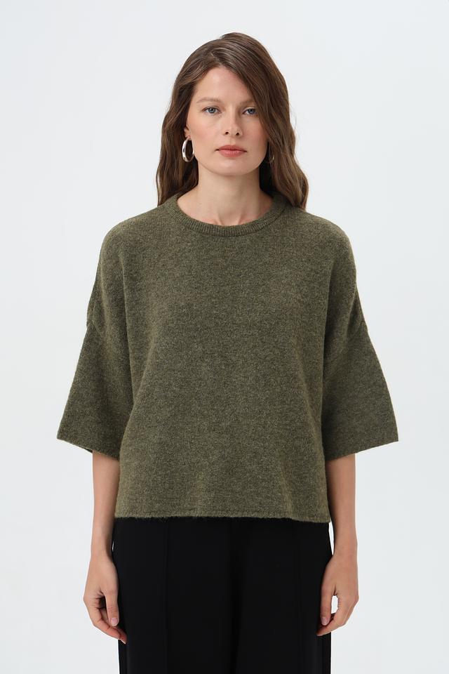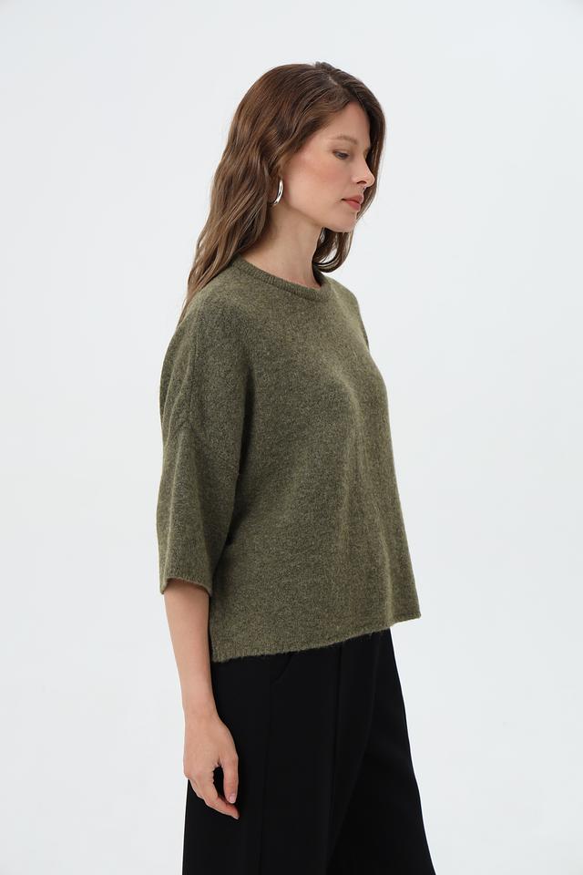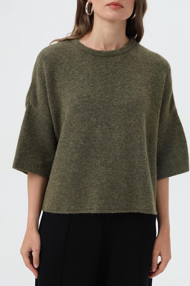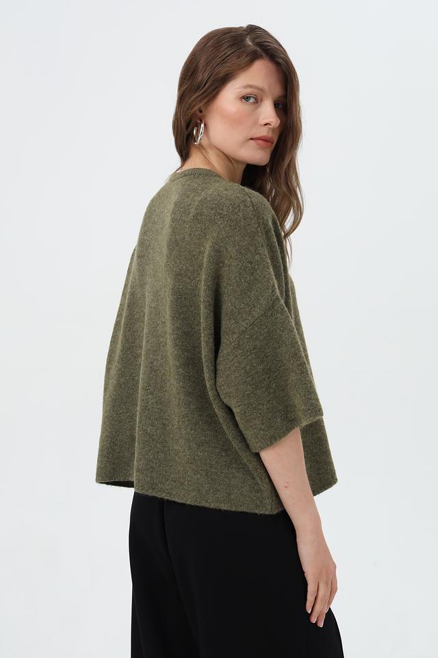 Модель имеет свободный крой, который не сковывает движений и обеспечивает комфорт в течение всего дня. Рукав 3/4 делает пуловер универсальным и подходящим для любого времени года.