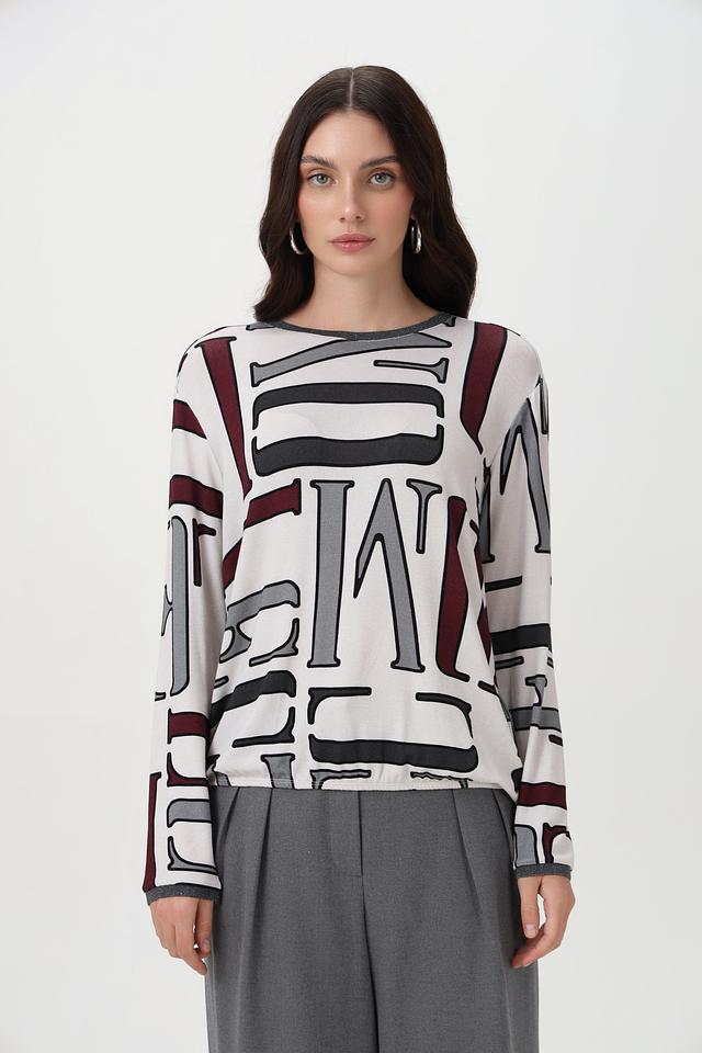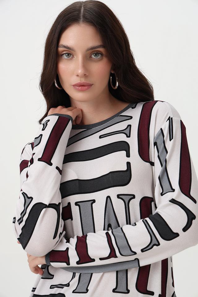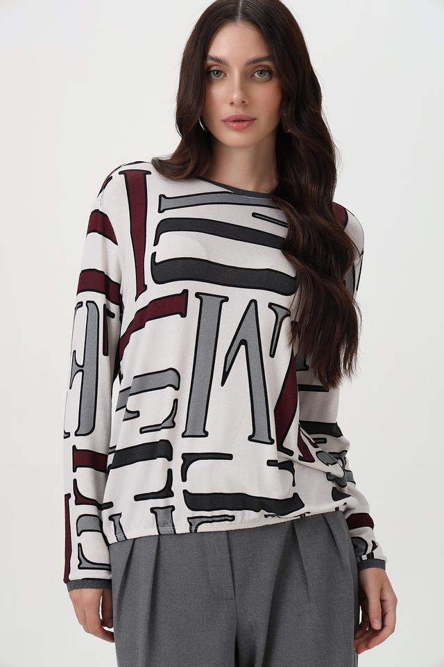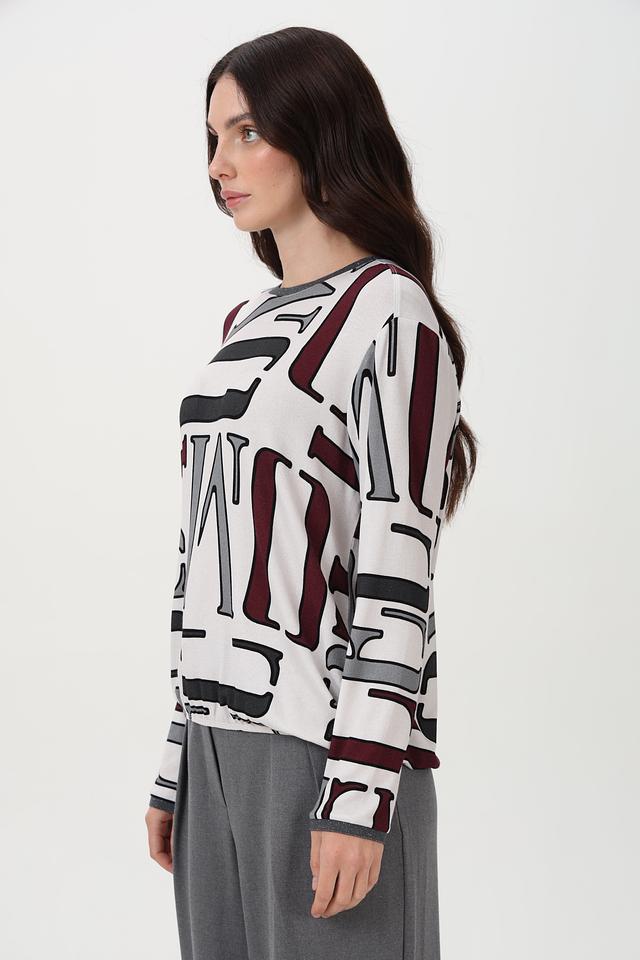 Этот стильный пуловер от Lecomte станет ярким акцентом вашего гардероба. Преобладающий белый цвет в сочетании с бордовым, серым и бежевым графичным принтом создает неповторимый образ.
