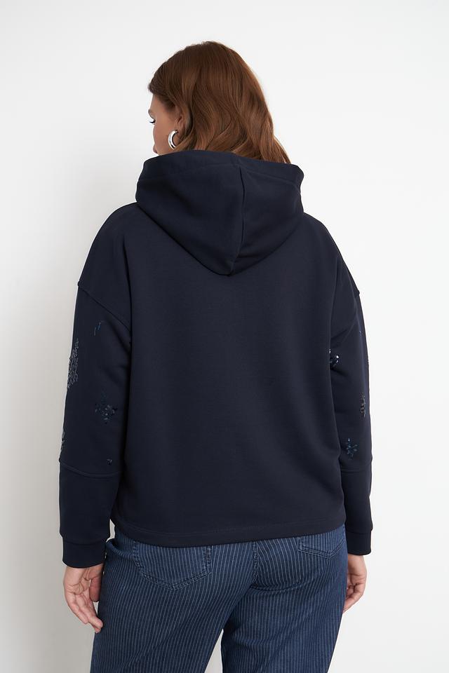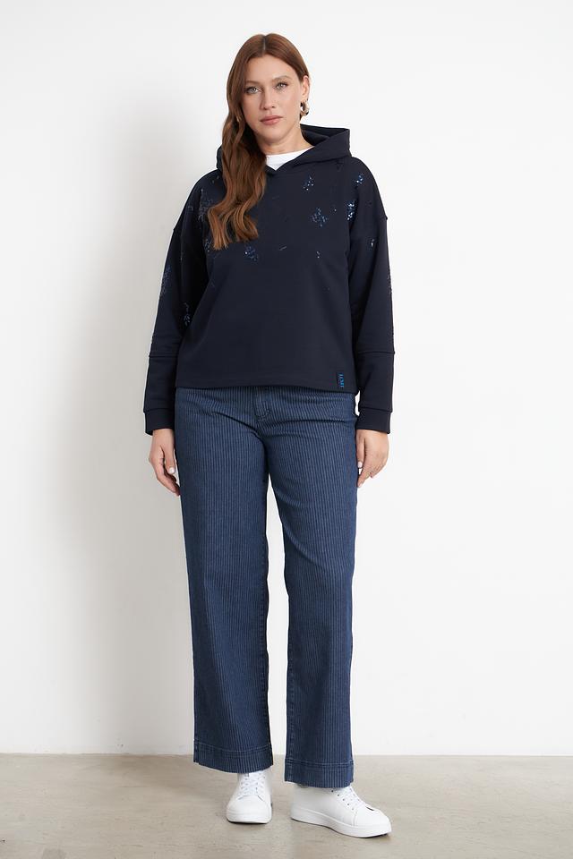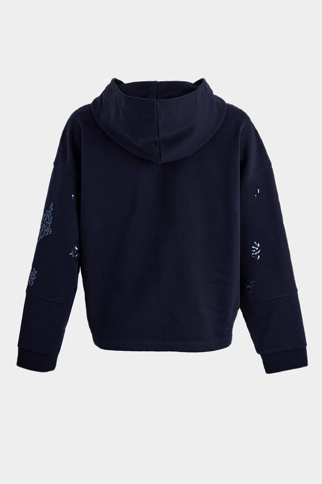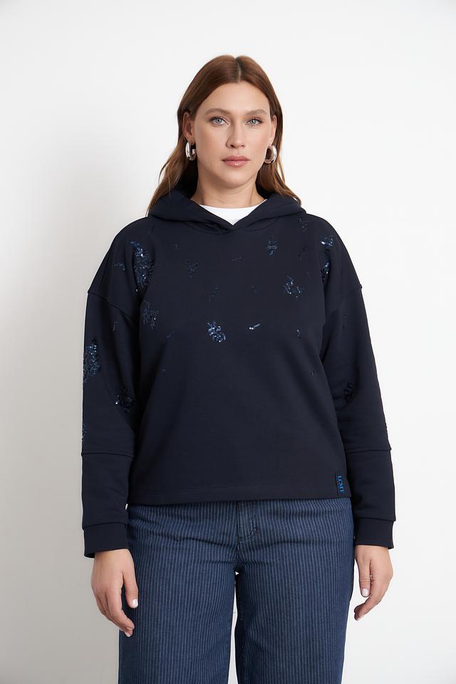 Тёмно-синий пуловер Lecomte с капюшоном, украшенным пайетками, станет стильным дополнением к вашему гардеробу. Модель свободного кроя выполнена из мягкого хлопка с добавлением полиэстера для комфорта и долговечности. Состав: хлопок 75%, полиэстер 25%