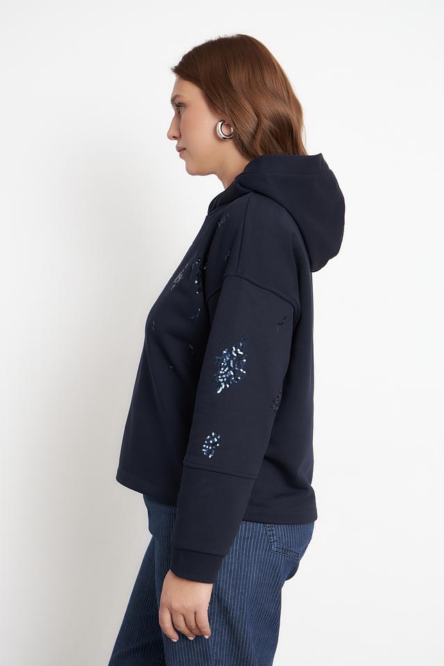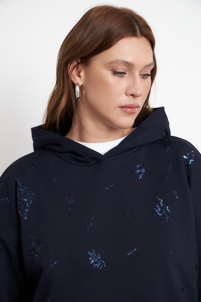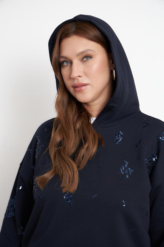Пуловер имеет свободный крой, капюшон и длинные рукава. Особый акцент сделан на декор – передняя часть и рукава украшены мерцающими пайетками, которые придают изделию праздничный вид. Это делает пуловер подходящим как для повседневной носки, так и для особых случаев.