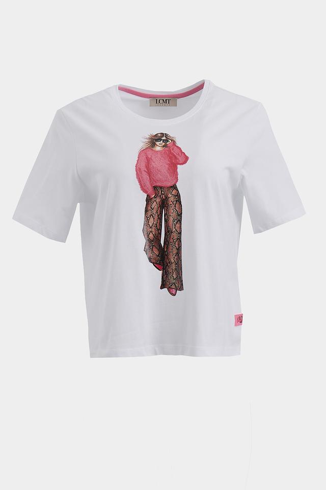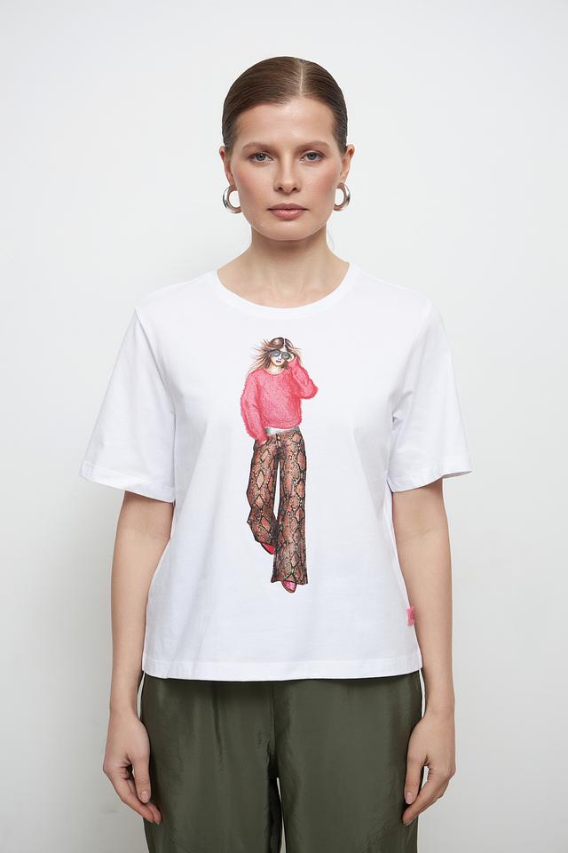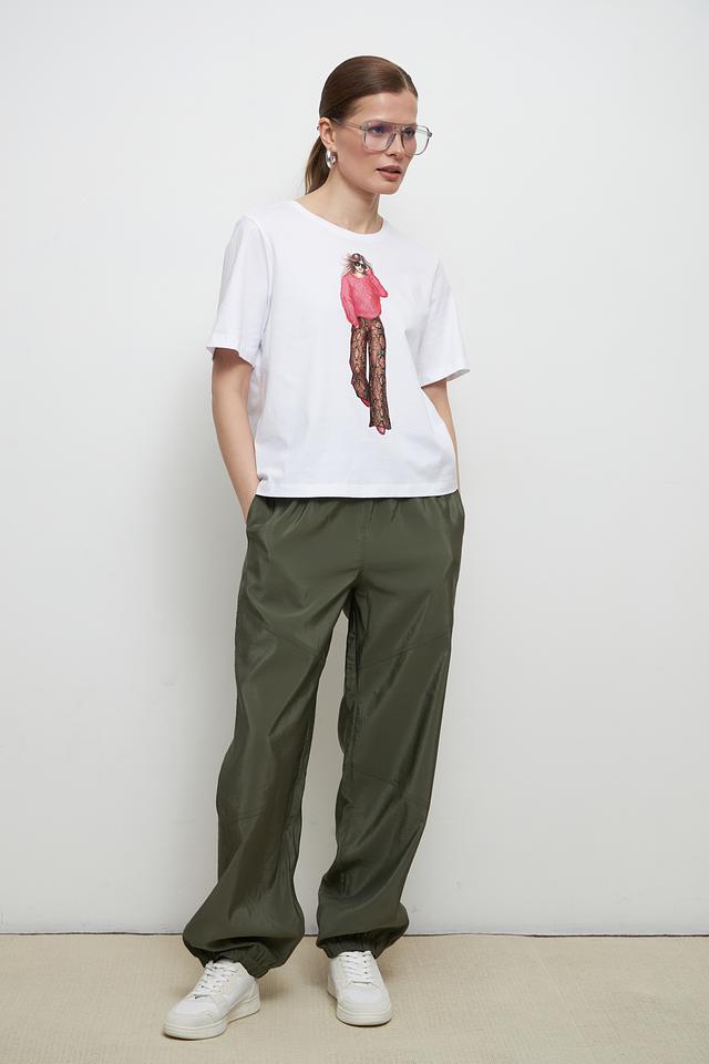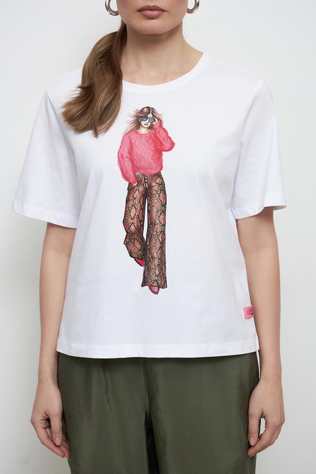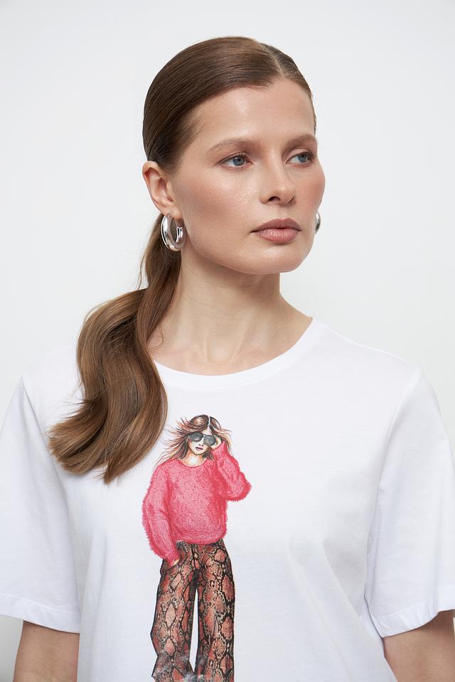 Основным акцентом футболки является яркий и оригинальный принт с изображением девушки в стильной одежде. Этот принт добавляет образу индивидуальность и выразительность.