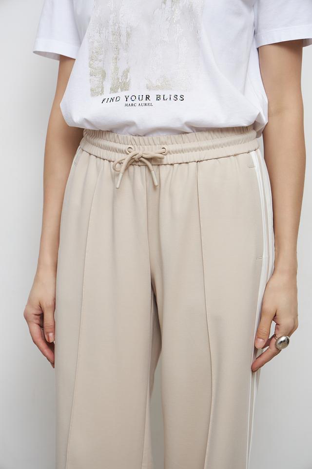 По бокам брюк расположены декоративные лампасы белого цвета, которые добавляют образу динамичности и стиля. Брюки изготовлены из качественного материала, сочетающего в себе вискозу (55%), полиамид (37%) и эластан (8%). Этот состав обеспечивает мягкость, приятные тактильные ощущения и хорошую износостойкость.