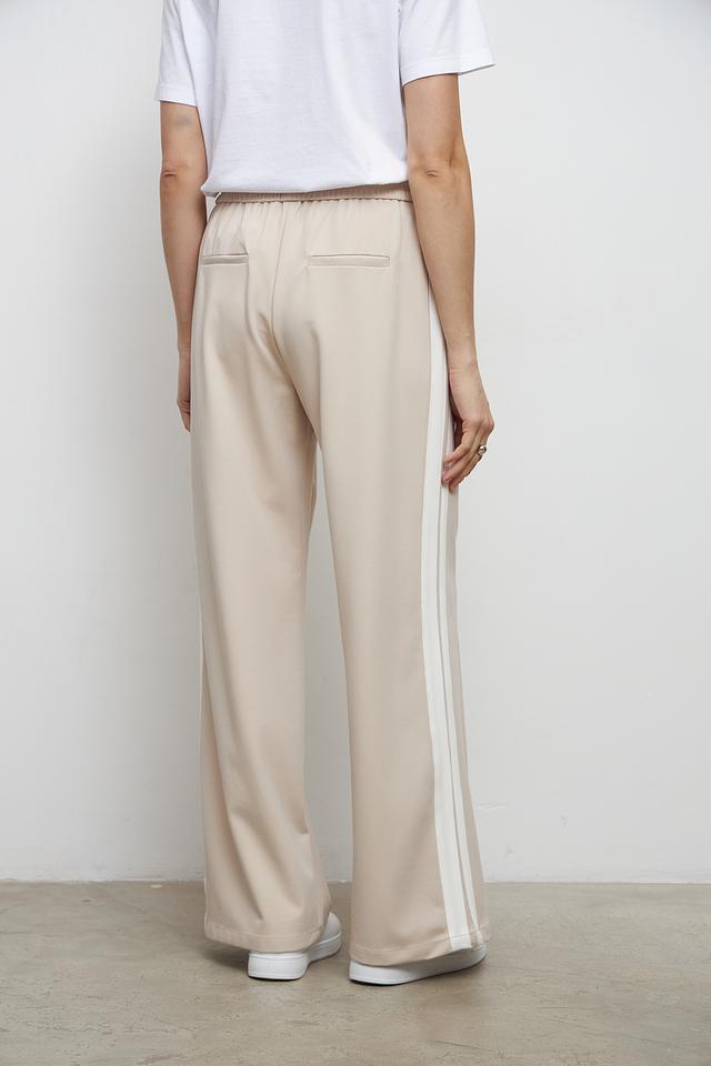 По бокам брюк расположены декоративные лампасы белого цвета, которые добавляют образу динамичности и стиля. Брюки изготовлены из качественного материала, сочетающего в себе вискозу (55%), полиамид (37%) и эластан (8%). Этот состав обеспечивает мягкость, приятные тактильные ощущения и хорошую износостойкость.