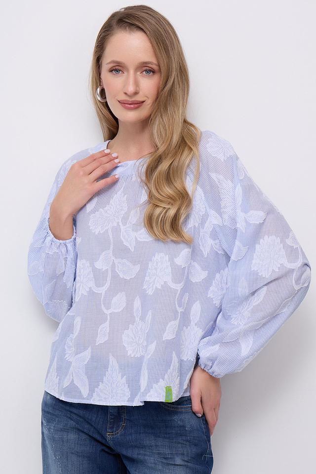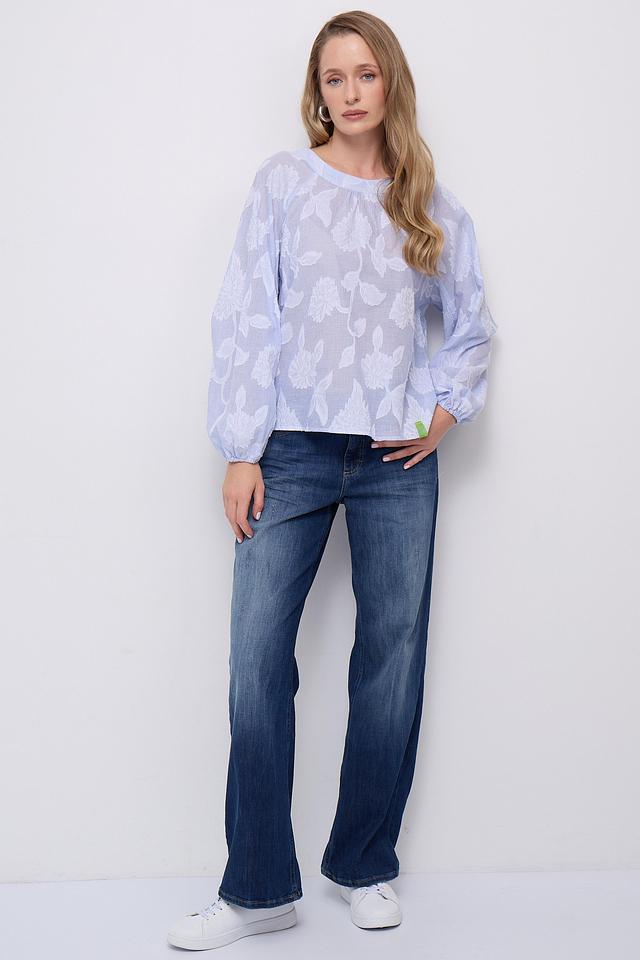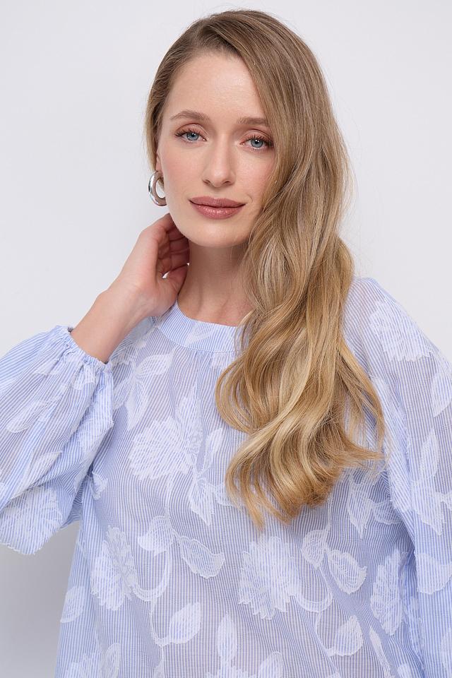 Блуза имеет легкий, воздушный крой и рукава-фонарики, которые придают ей романтичный вид. Нежный цветочный принт на голубом фоне добавляет образу женственности и легкости.