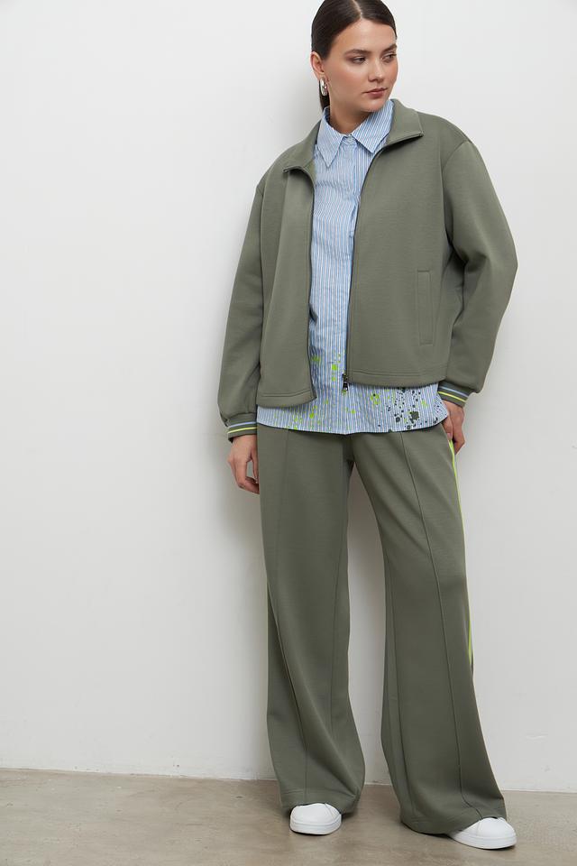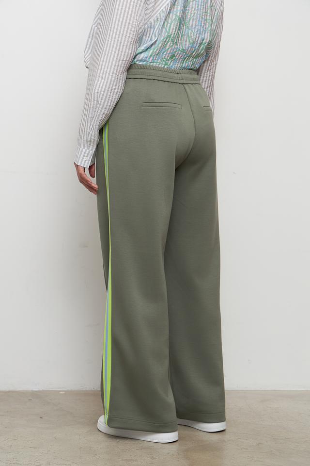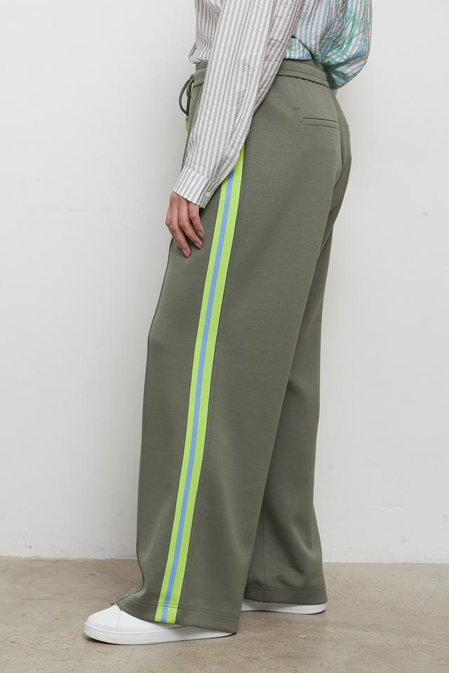 Брюки имеют прямой крой и широкие штанины, что обеспечивает свободу движений и создает современный силуэт. Эластичный пояс с кулиской позволяет регулировать посадку по фигуре. Боковые полоски яркого лаймового цвета добавляют динамики и оригинальности.