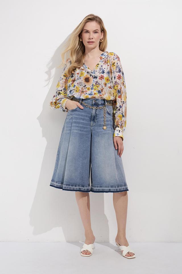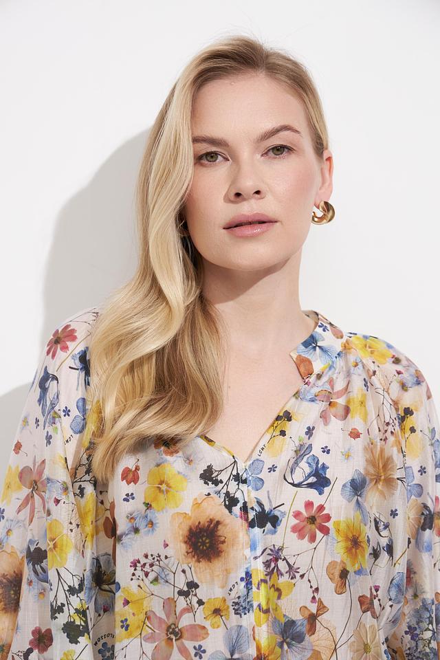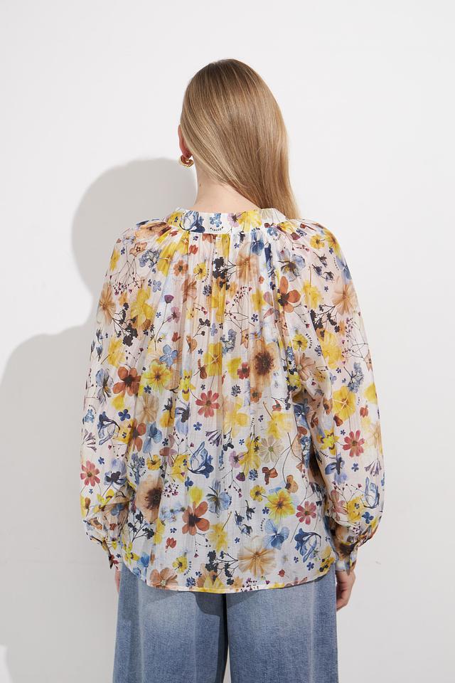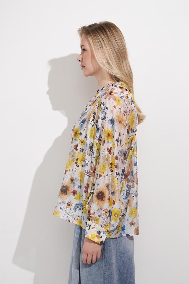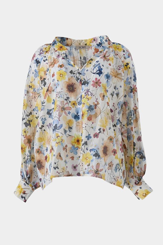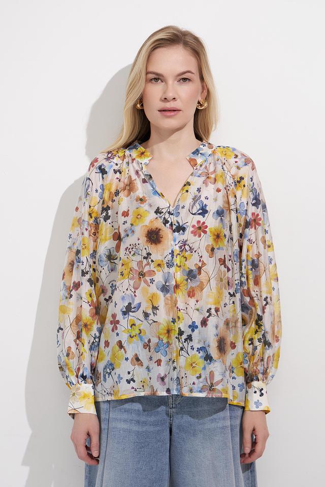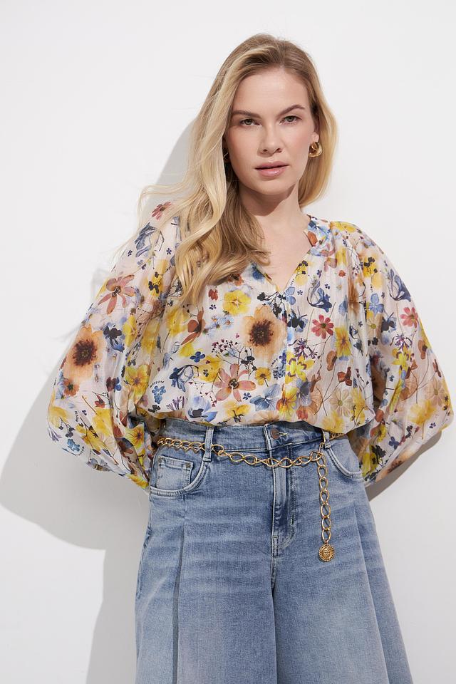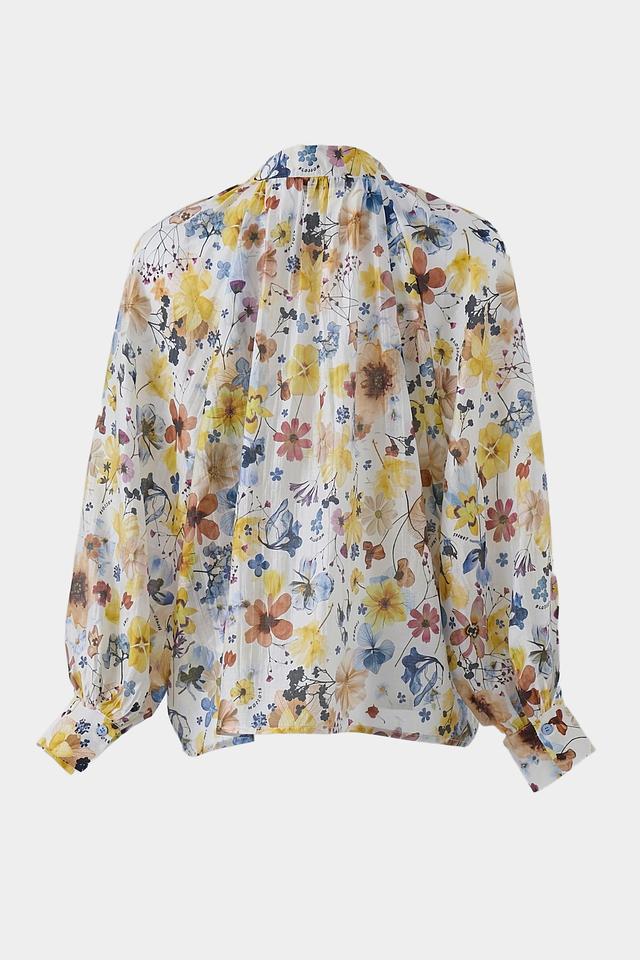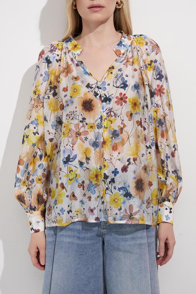 Эта блуза от Lecomte – идеальный выбор для создания романтичного и женственного образа. Блуза выполнена в светло-бежевом цвете и украшена ярким цветочным принтом, включающим в себя оттенки жёлтого, голубого, розового и оранжевого.