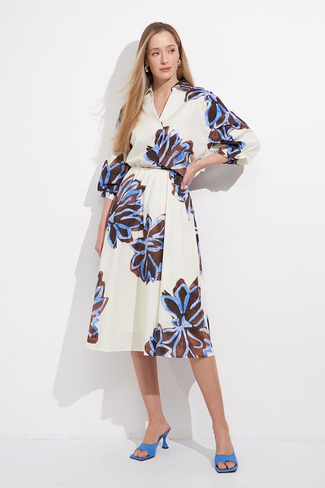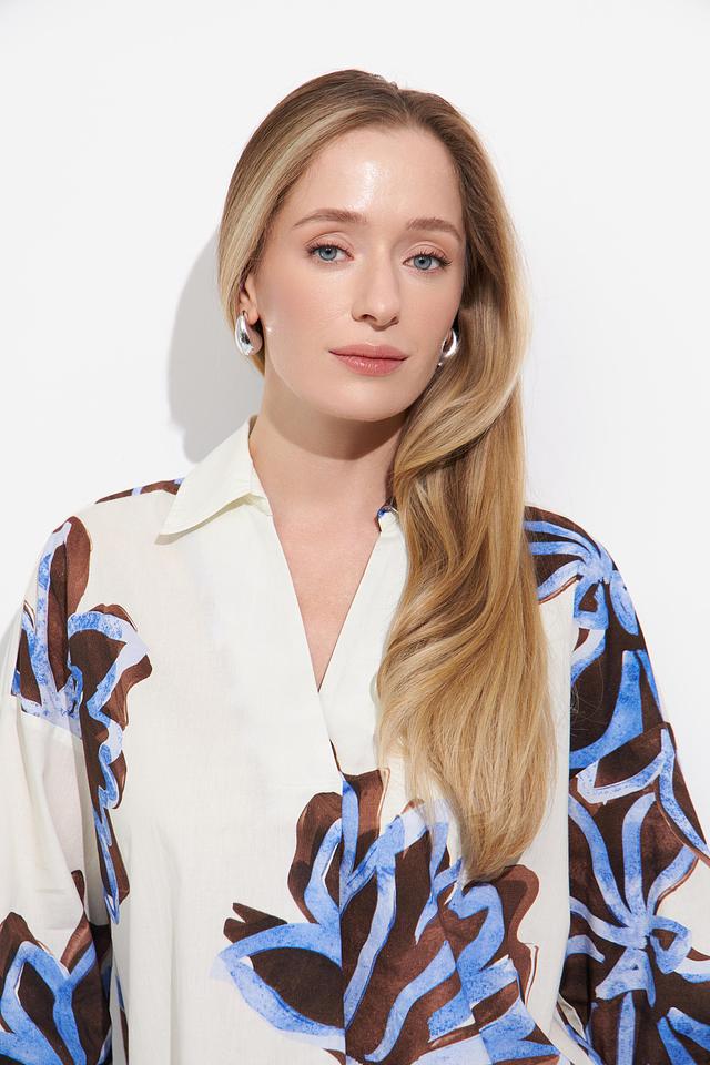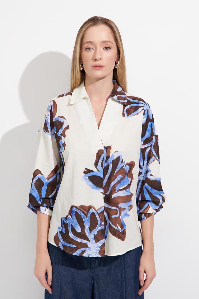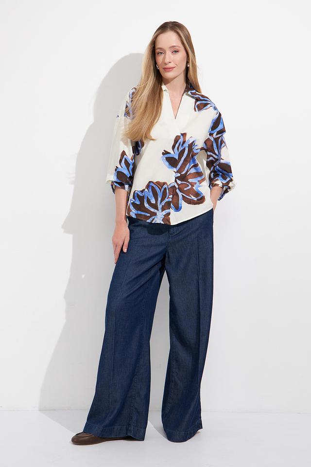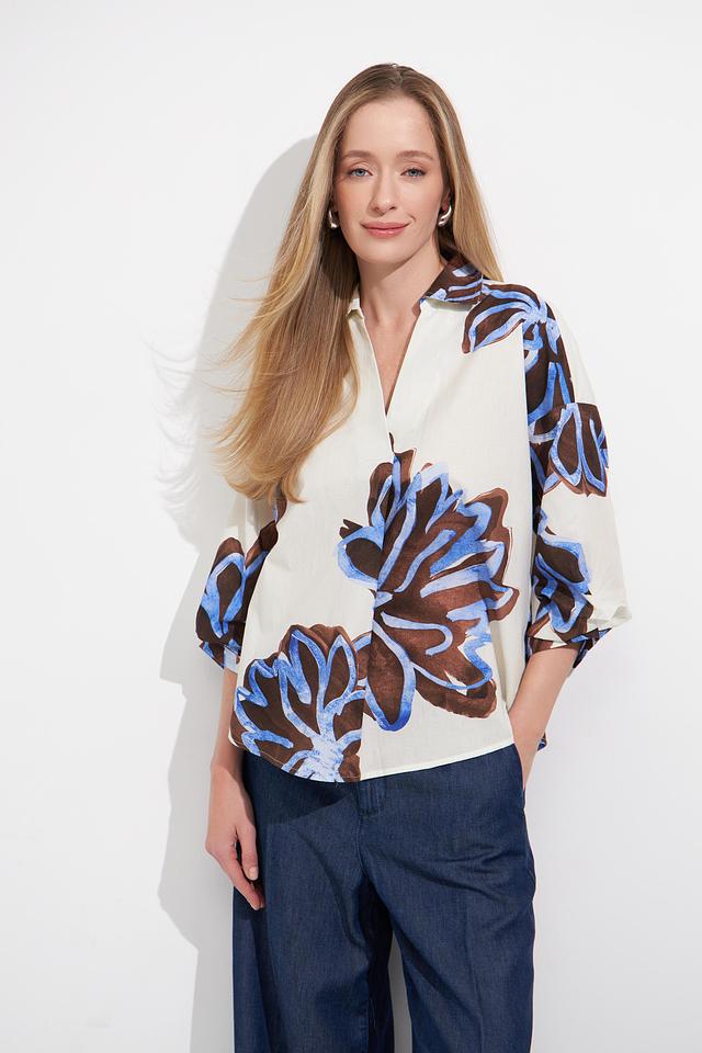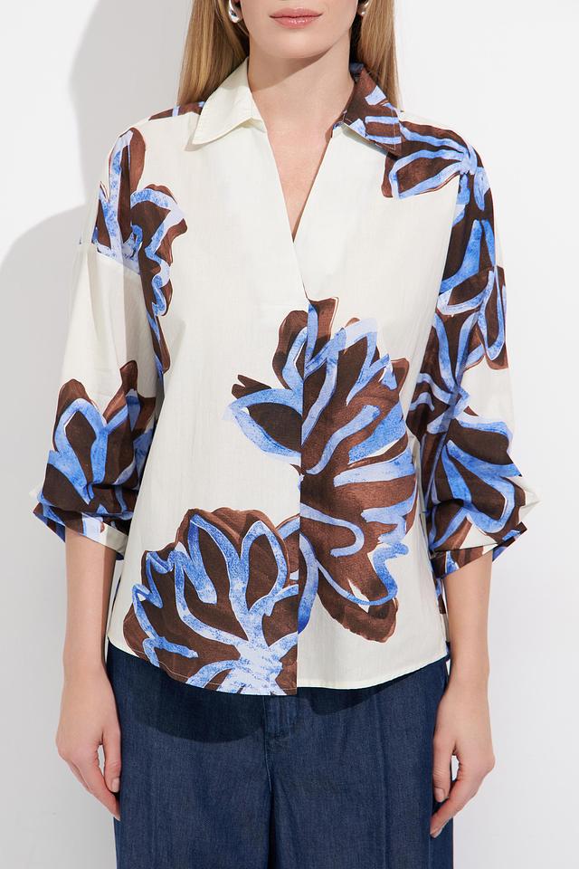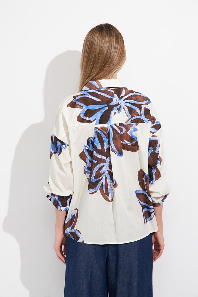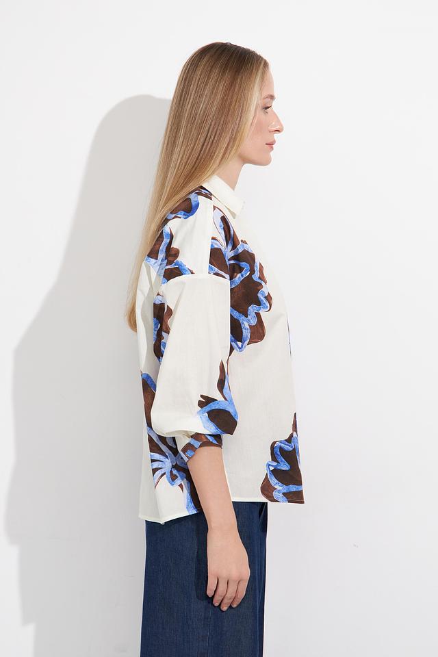 Основной цвет блузы – белый, который служит прекрасным фоном для яркого цветочного принта. Принт выполнен в сочетании синих и коричневых оттенков, создавая эффектный и запоминающийся дизайн.
