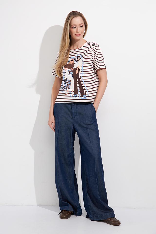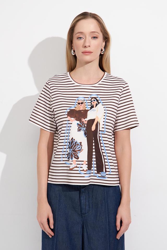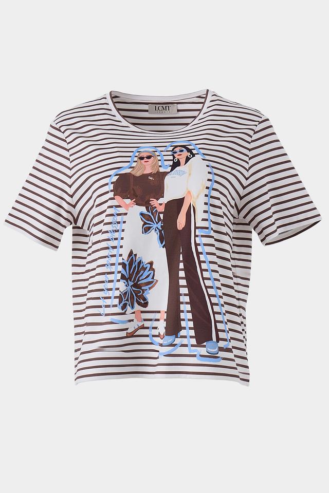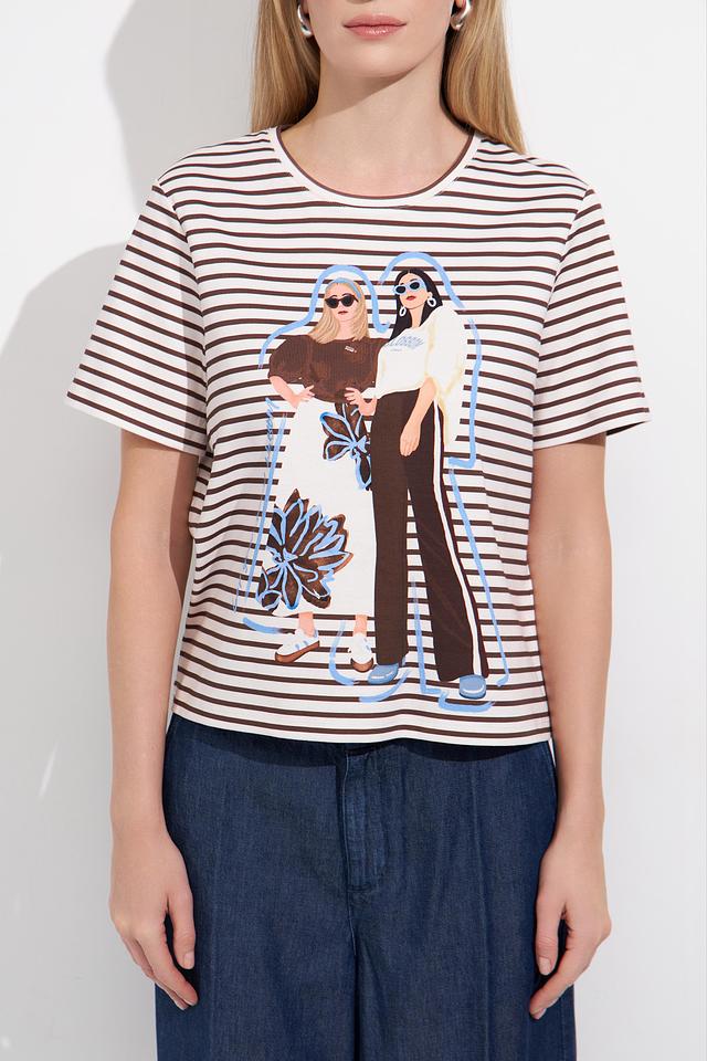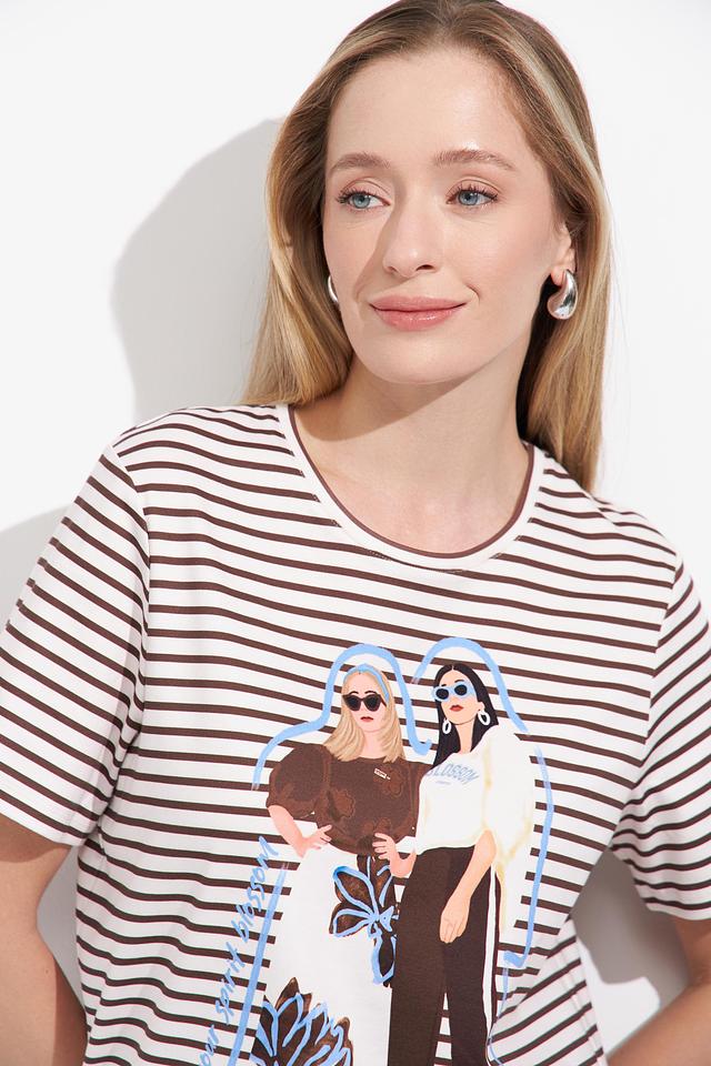 Основной цвет футболки – белый, дополненный широкими черными полосами. Главная деталь – крупный, красочный принт с изображением модных девушек, выполненный в различных цветах и стилях.