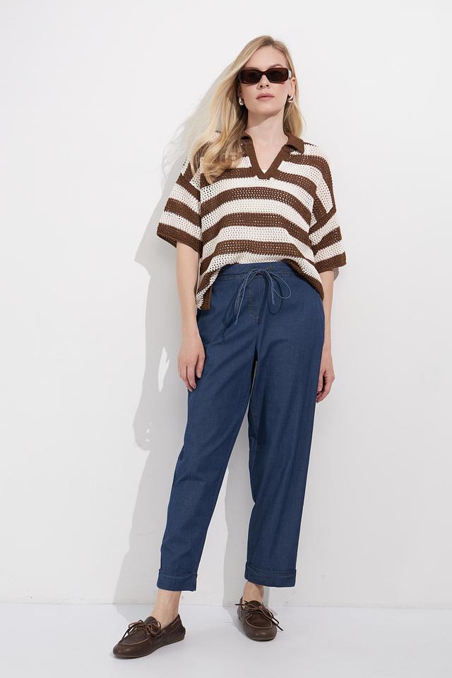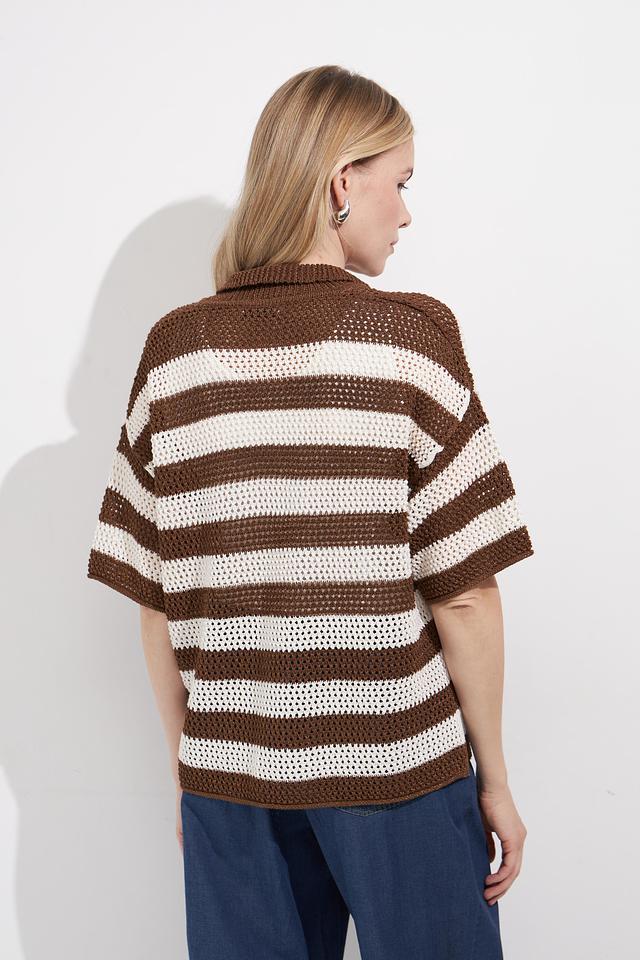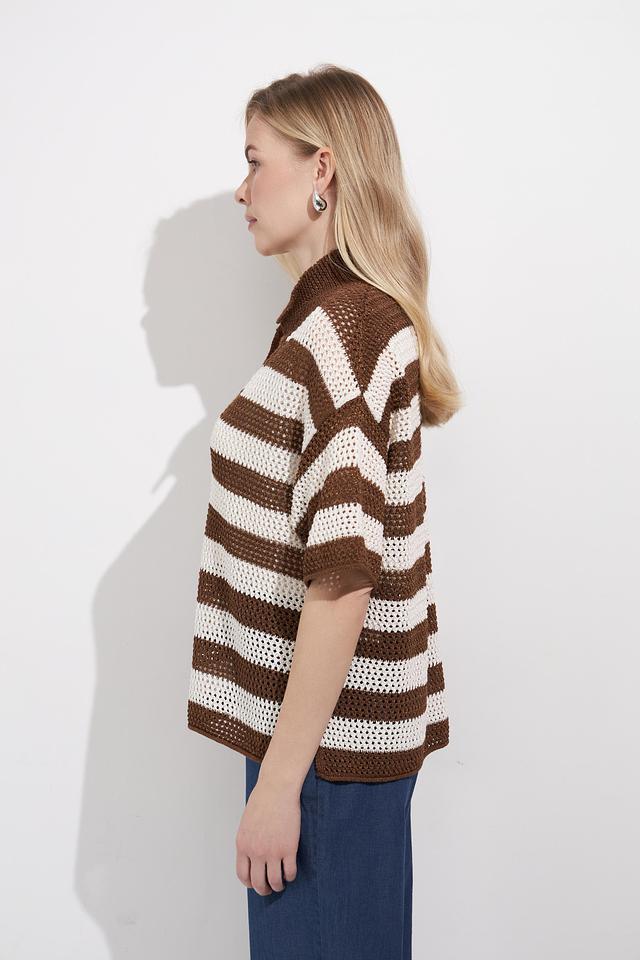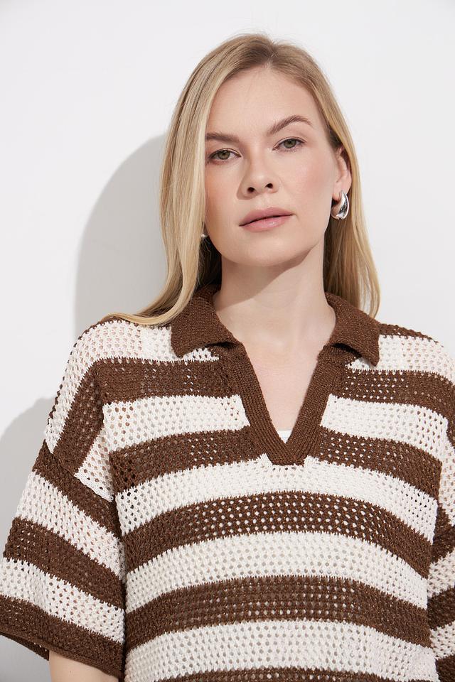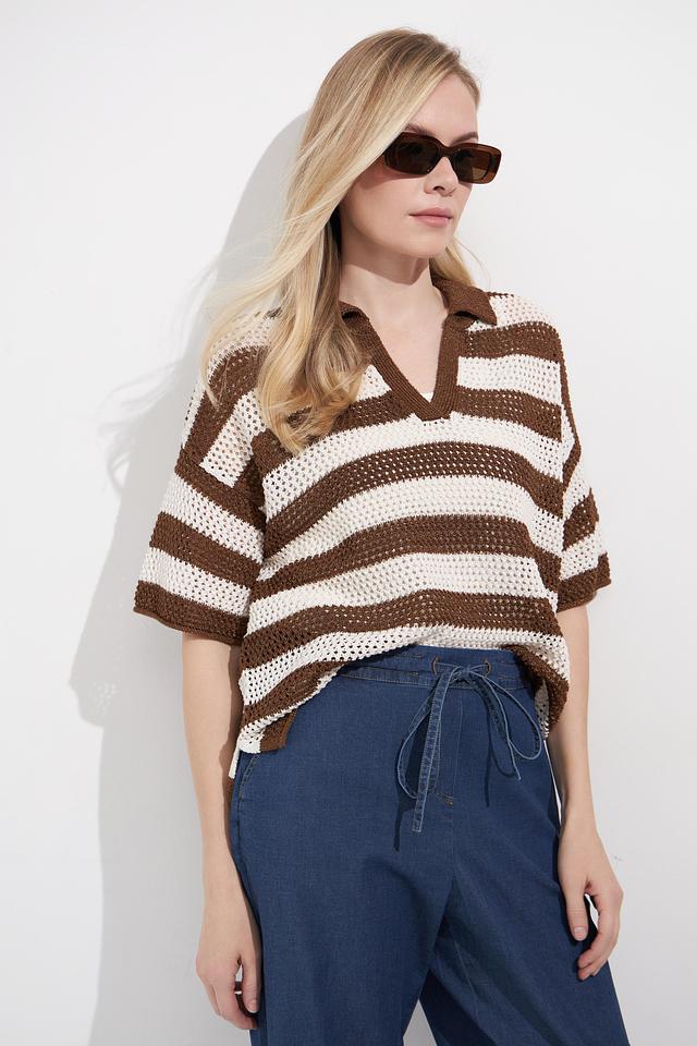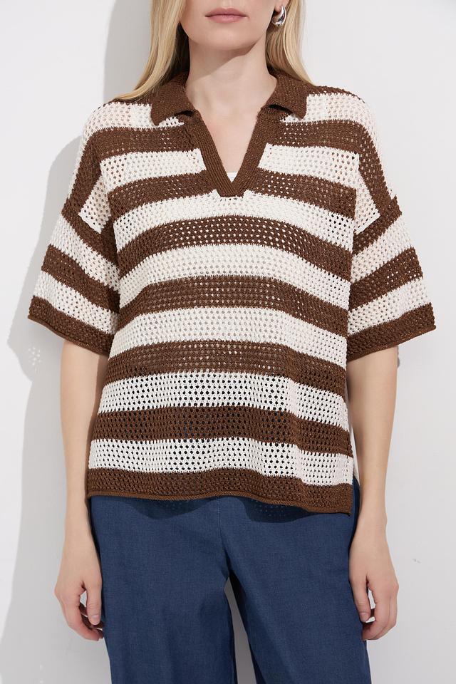 Женский пуловер Lecomte коричнево-бежевого цвета с коротким рукавом и V-образным вырезом. Модель выполнена в широкую полоску и имеет воротник-поло, что придает ей оригинальный вид. Состав: вискоза 78%, полиэстер 22%