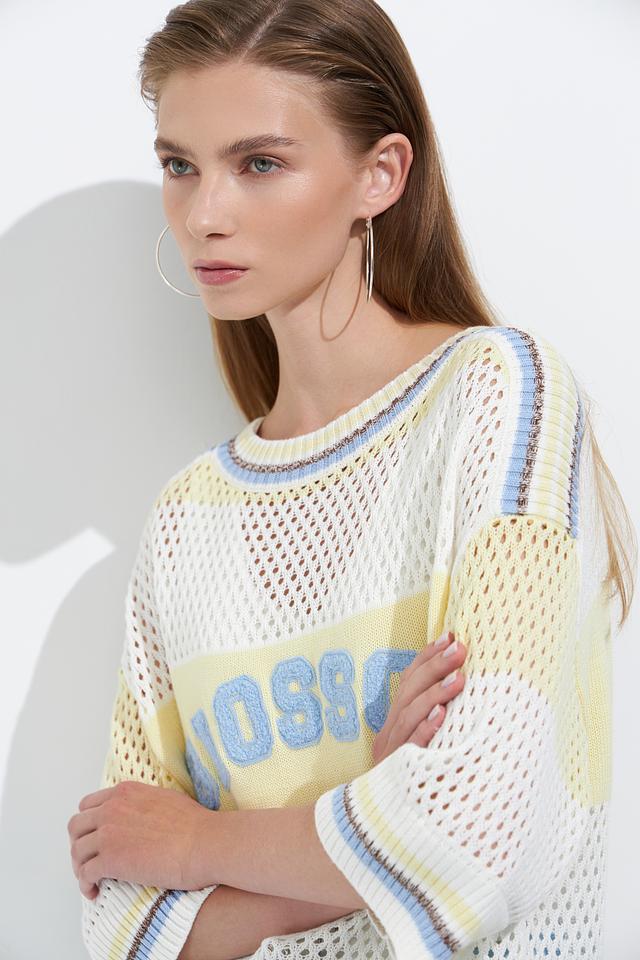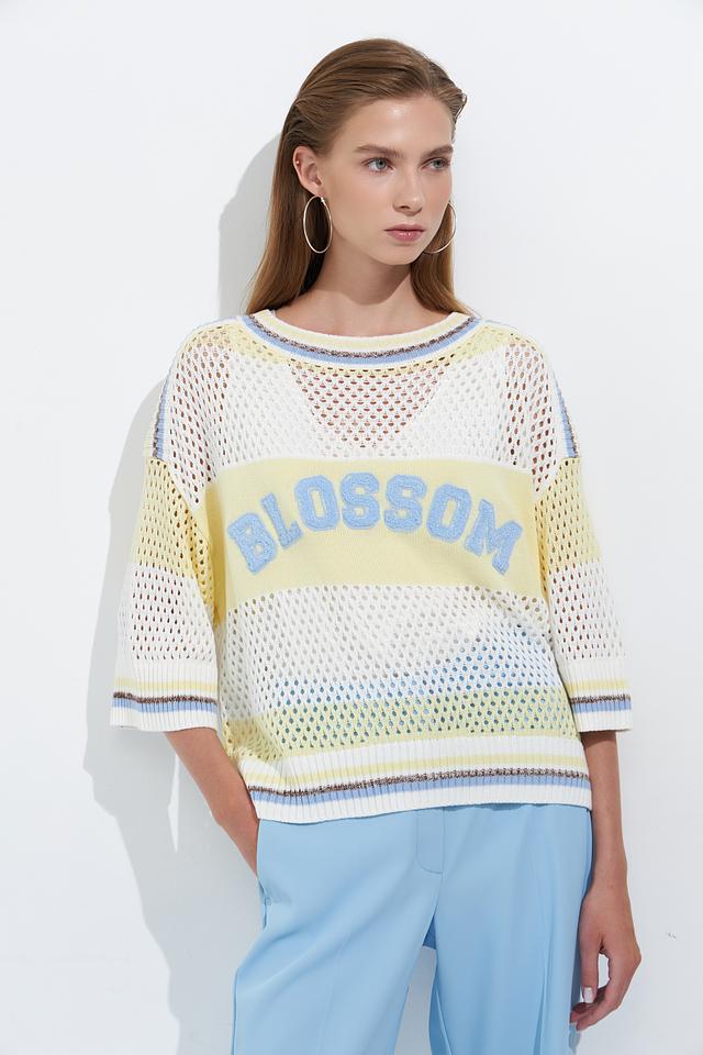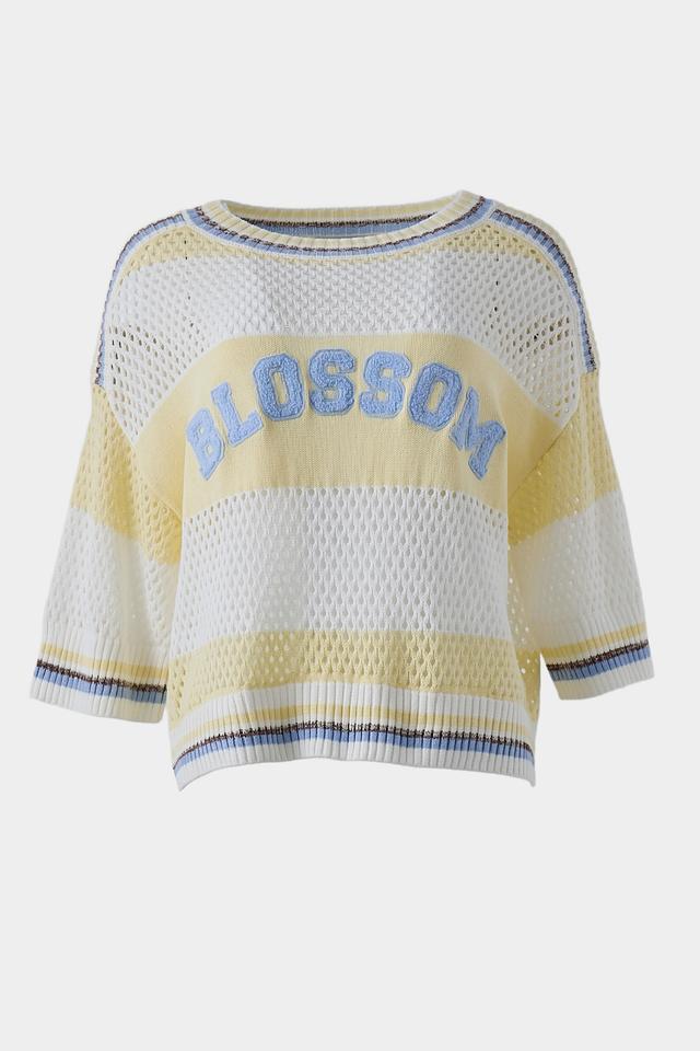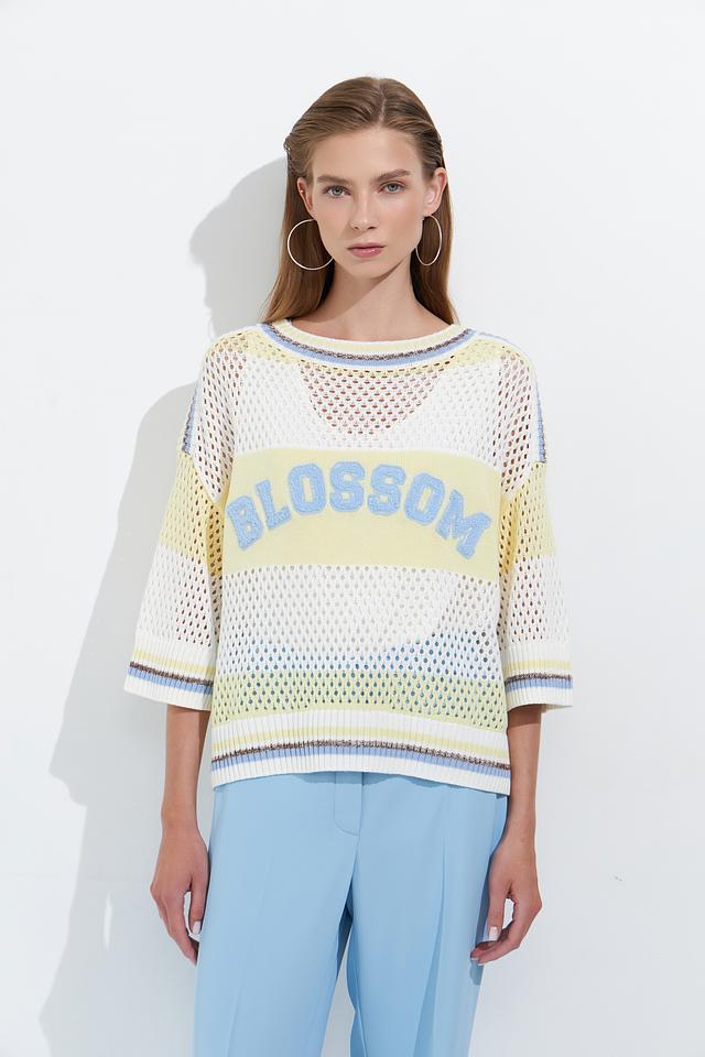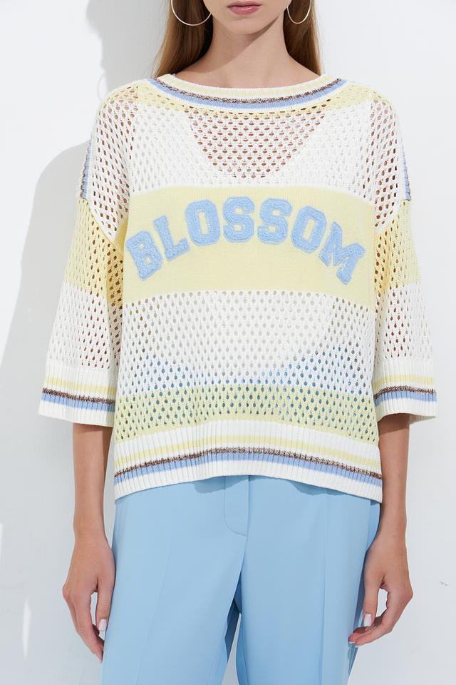 Женский пуловер Lecomte светло-жёлтого цвета с надписью "Blossom" выполнен из хлопкового трикотажа с ажурной вязкой. Модель имеет свободный крой и короткие рукава, идеально подходит для создания лёгкого летнего образа. Состав: хлопок 100%