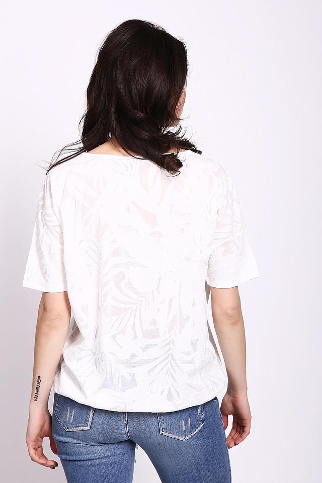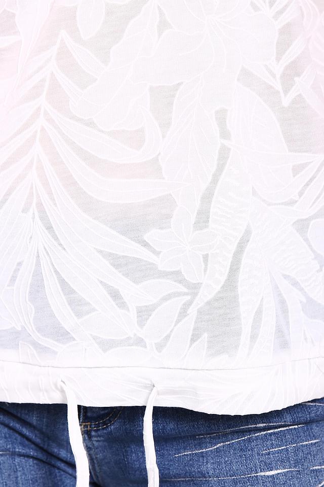 Блуза имеет свободный крой, короткие рукава и круглый вырез горловины. По низу изделия предусмотрена кулиска с завязками, позволяющая регулировать силуэт и создавать различные образы.