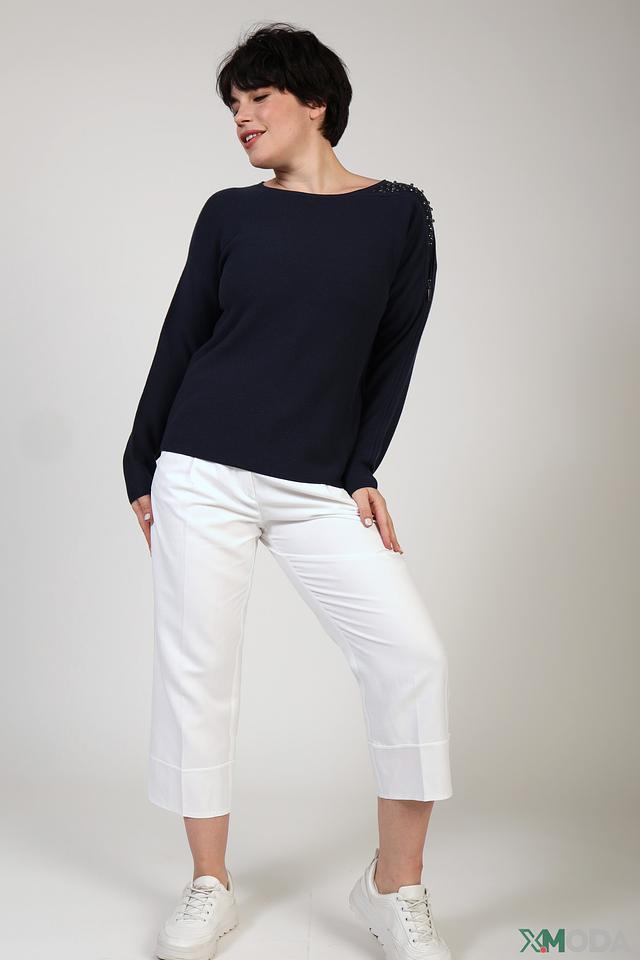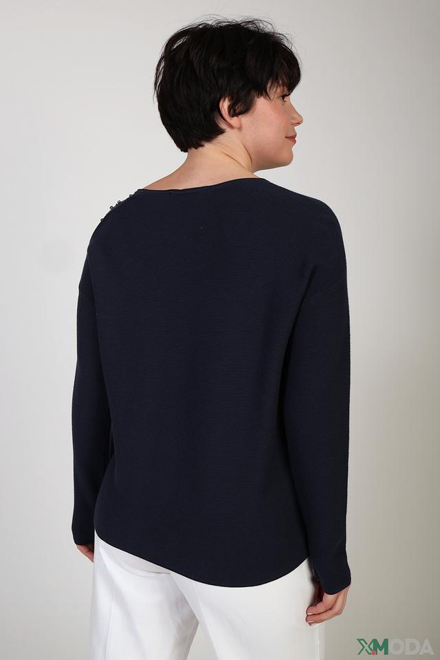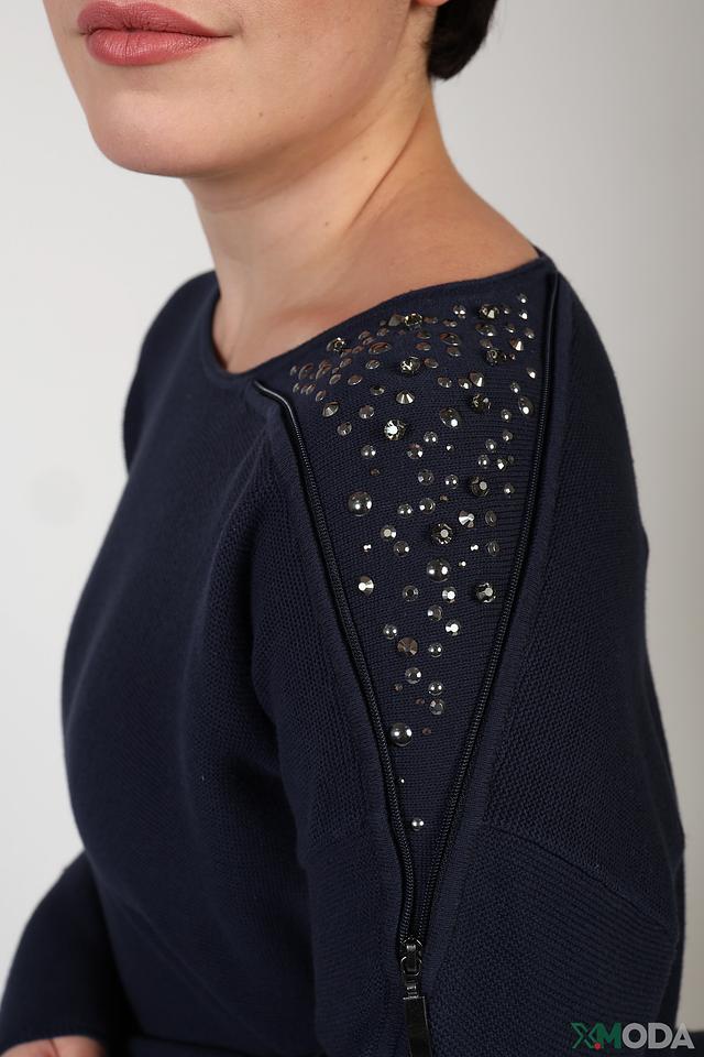 Особенностью данного пуловера является декоративная отделка на плече, выполненная в виде страз и молнии. Этот элемент придает изделию изысканность и оригинальность. Округлый вырез горловины и длинные рукава делают пуловер универсальным для различных погодных условий.