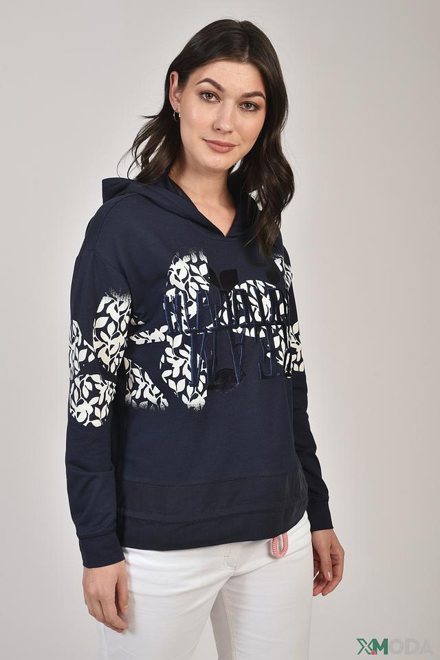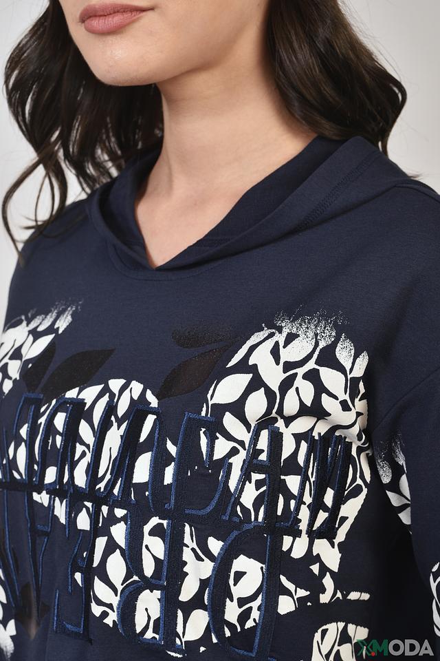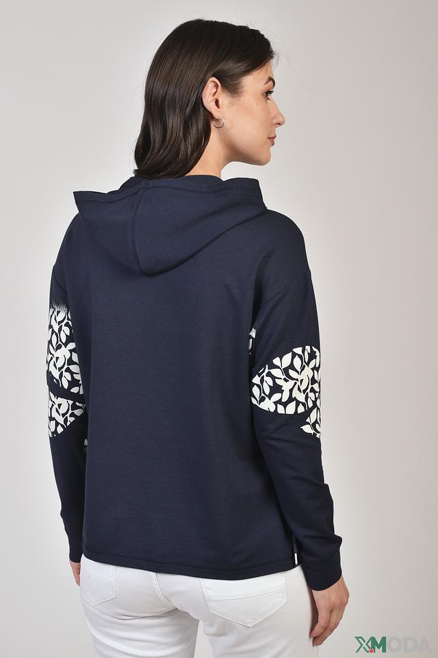Синий пуловер Lecomte с капюшоном и оригинальным цветочным принтом на рукавах и груди. Модель выполнена из мягкого и приятного к телу сочетания хлопка, модала и эластана, обеспечивающего комфорт при носке. Состав: хлопок 47%, модал 47%, эластан 6%
