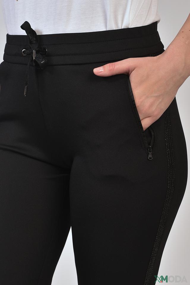 Брюки выполнены из качественного полиэстера с добавлением эластана, что обеспечивает комфортную посадку и свободу движений. Эластичный пояс дополнен шнурком для регулировки посадки. Модель имеет два боковых кармана и манжеты внизу штанин.