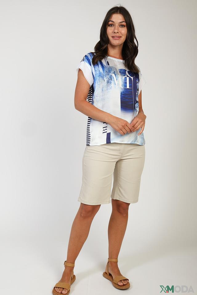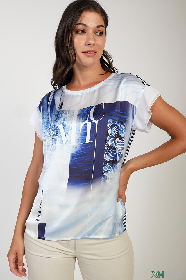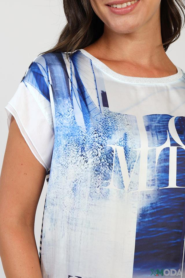 Дизайн футболки представлен в виде абстрактного принта в голубых и белых тонах, создающего эффектный визуальный образ. Короткие рукава и свободный крой обеспечивают комфорт в жаркую погоду.