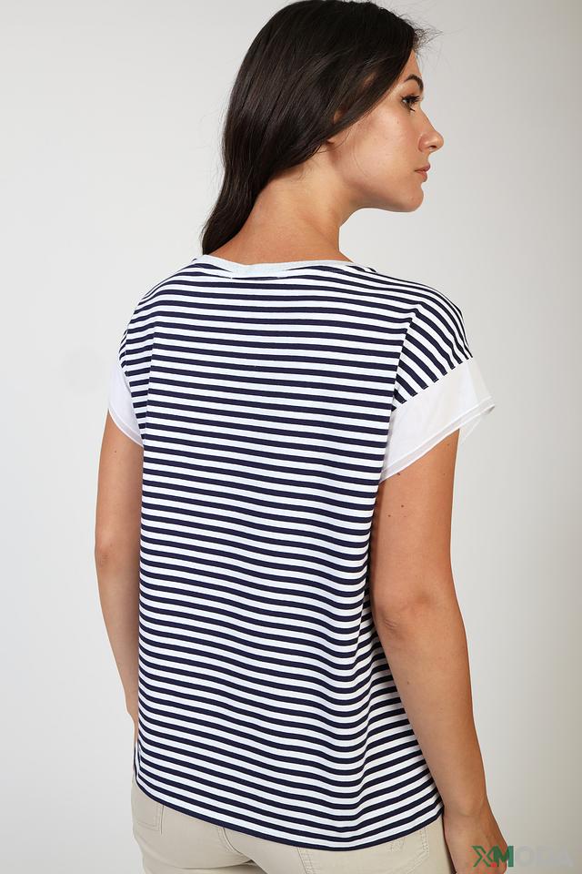 Задняя часть футболки выполнена в классическую сине-белую полоску. Эта модель идеально подходит для создания повседневных образов, сочетаясь с джинсами, шортами или юбками. Футболка Lecomte – это стильное и удобное решение для активных женщин.