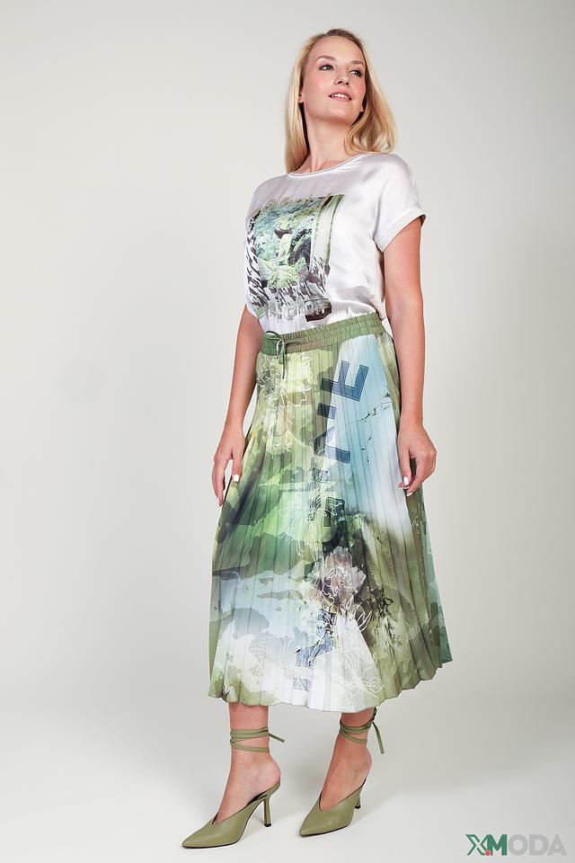 Юбка имеет классический крой плиссе, который визуально стройнит фигуру и добавляет динамики. Принт с абстрактными цветочными мотивами в зелёных и белых оттенках делает эту юбку уникальной и привлекательной.