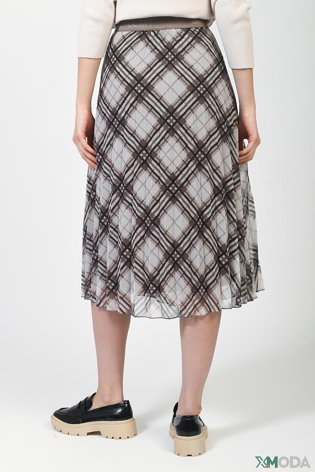 Юбка имеет классический крой плиссе и длину миди. Особенностью модели является клетчатый принт в сочетании серых, коричневых и белых оттенков. Эластичный пояс обеспечивает удобную посадку по фигуре.