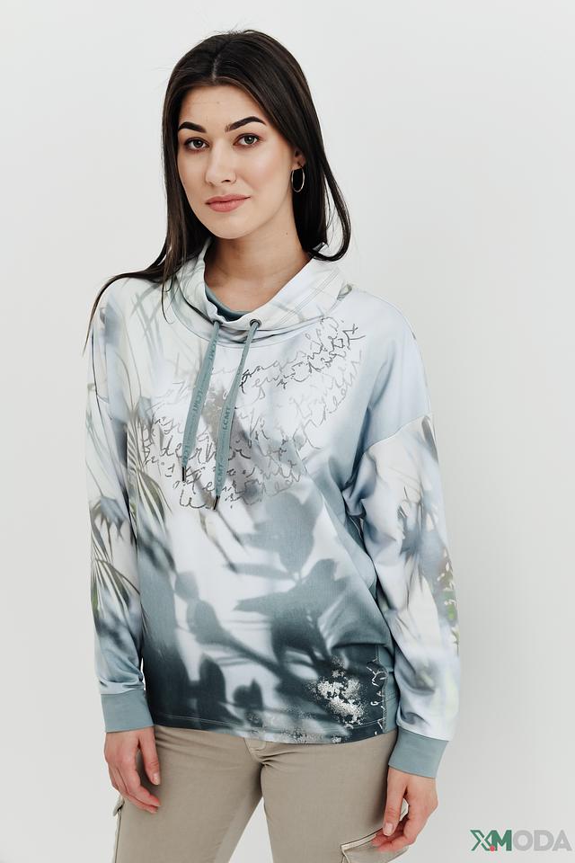 Пуловер имеет свободный крой и удобный капюшон с регулируемыми шнурками. Особенностью модели является яркий и необычный принт, сочетающий в себе абстрактные узоры и изображение листьев. Цветовая гамма пуловера включает в себя оттенки светло-серого, голубого и белого, создавая свежий и современный образ.