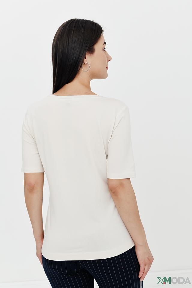 Модель имеет прямой крой, короткие рукава и круглый вырез горловины. Футболка изготовлена из высококачественного материала, состоящего из 48% хлопка, 48% модала и 4% эластана. Хлопок обеспечивает воздухопроницаемость и комфорт, модал придает мягкость и шелковистость, а эластан – эластичность и хорошую посадку по фигуре.