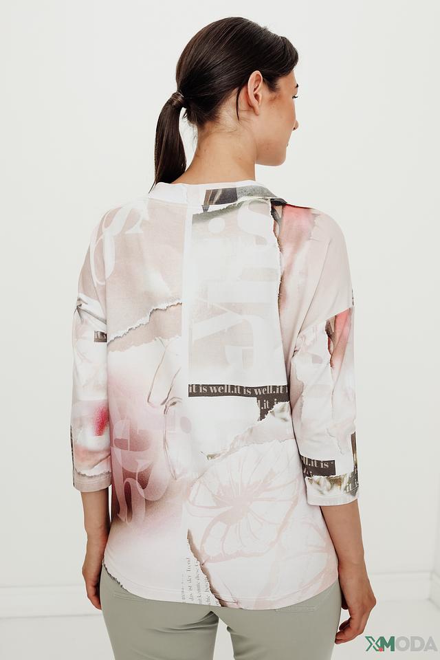 Пуловер имеет свободный крой и короткие рукава, что делает его идеальным для создания повседневных образов. Оригинальный принт с изображением цветов и надписями добавляет изделию индивидуальности и привлекательности.