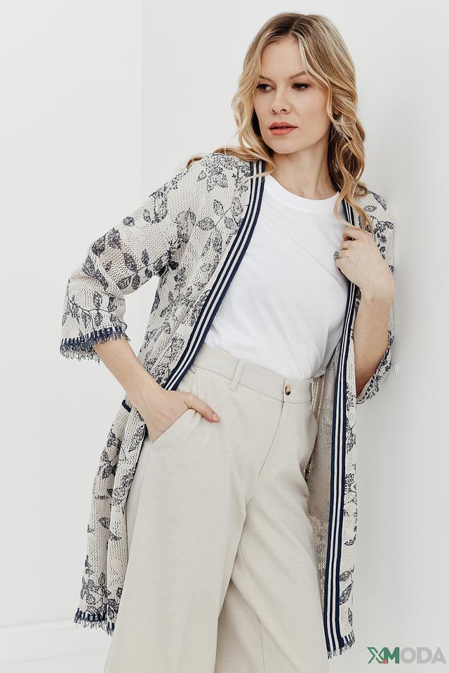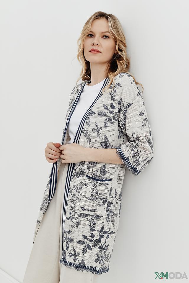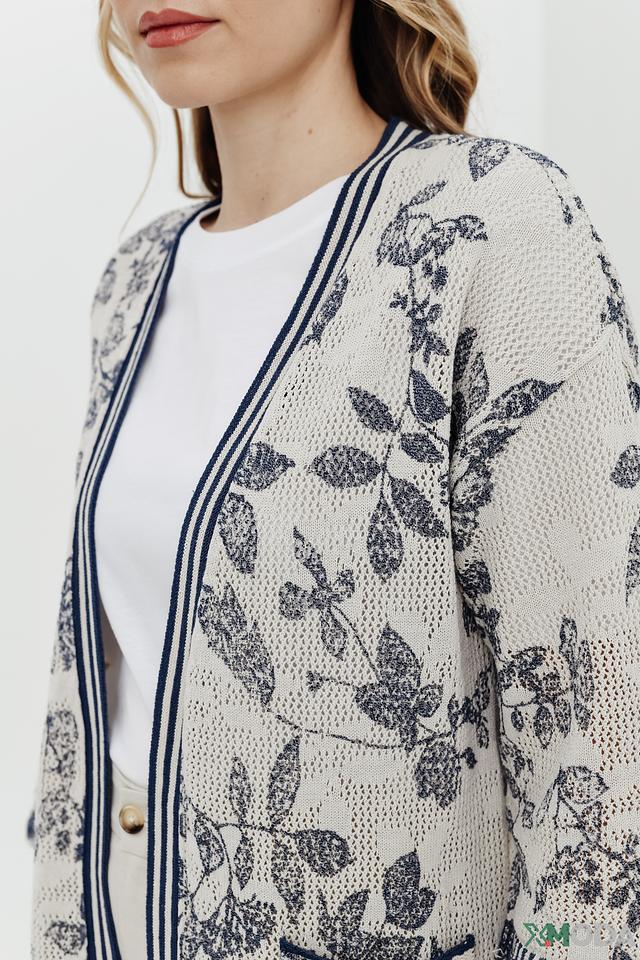 Модель имеет свободный крой, что обеспечивает свободу движений и комфорт в носке. Отделка по краям и на рукавах выполнена в насыщенном синем цвете, что создает контрастный и стильный акцент. Жакет застегивается на скрытые пуговицы.