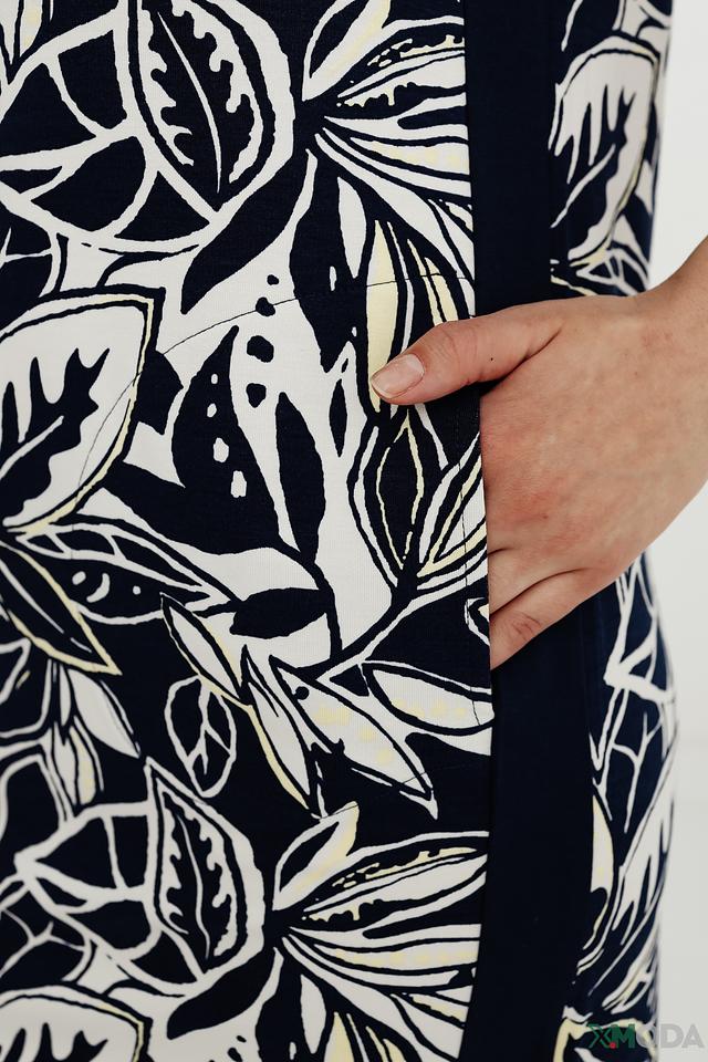 Платье имеет прямой, слегка приталенный силуэт, который выгодно подчеркивает фигуру, не сковывая движений. Короткие рукава и округлый вырез горловины делают его идеальным для теплой погоды. Боковые карманы добавляют практичности.