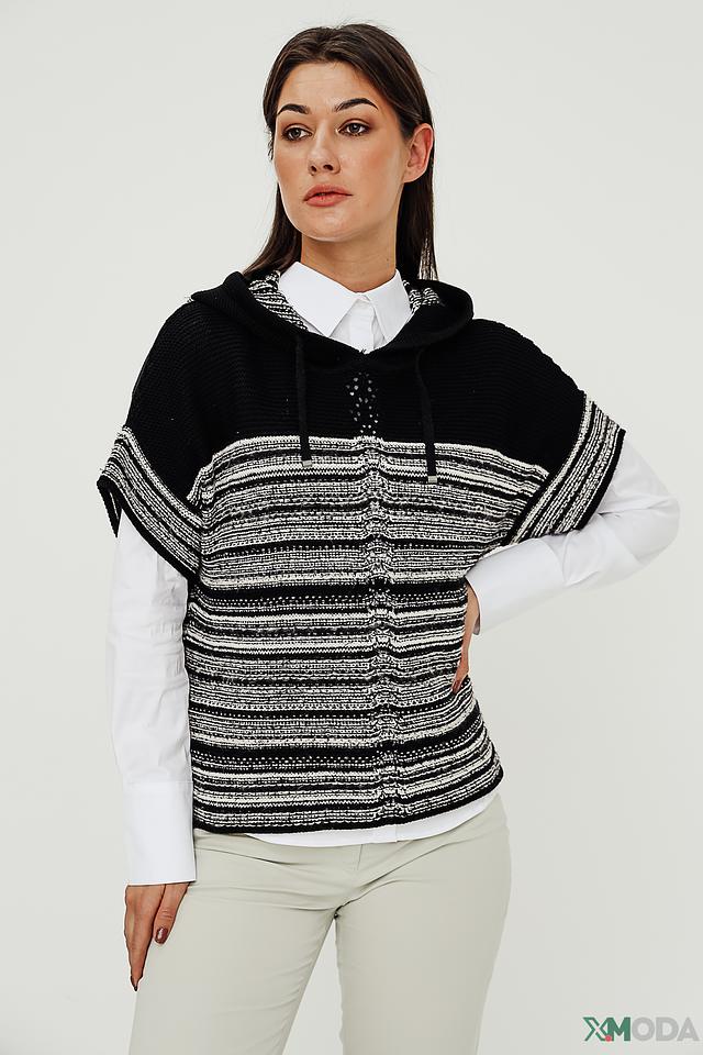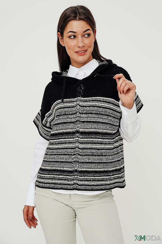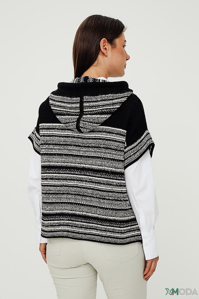 Модель имеет свободный крой, капюшон с кулисками и без застёжки. Жилет выполнен из смесового трикотажа, в состав которого входит 66% хлопка, 22% полиакрила и 12% полиамида. Такое сочетание материалов обеспечивает изделию мягкость, комфорт и практичность в уходе.