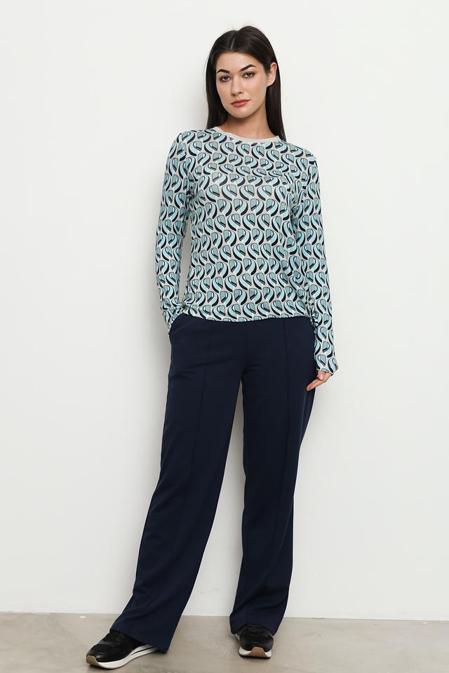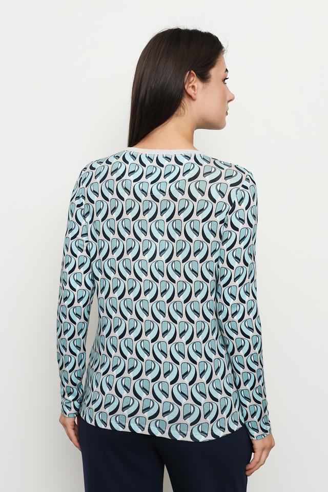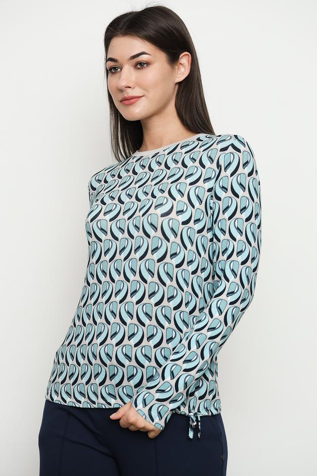 Пуловер имеет длинные рукава и круглый вырез горловины. Главная особенность модели – стильный геометрический принт, выполненный в светло-голубой, синей и белой цветовой гамме. Небольшой сбор с завязками по боку придает образу женственность.