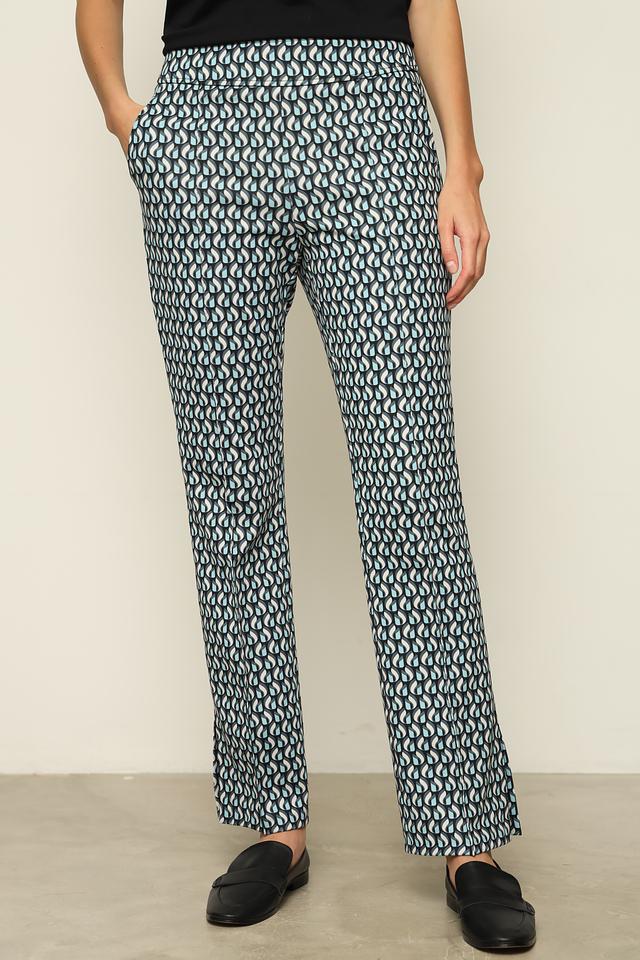Женские брюки Lecomte синего цвета с оригинальным геометрическим принтом станут стильным дополнением к вашему гардеробу. Модель выполнена из приятной к телу ткани с добавлением эластана для комфортной посадки. Состав: полиэстер 65%, хлопок 30%, эластан 5%