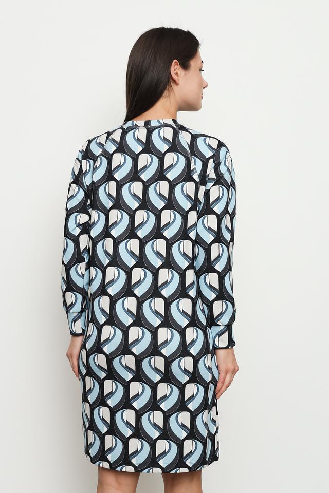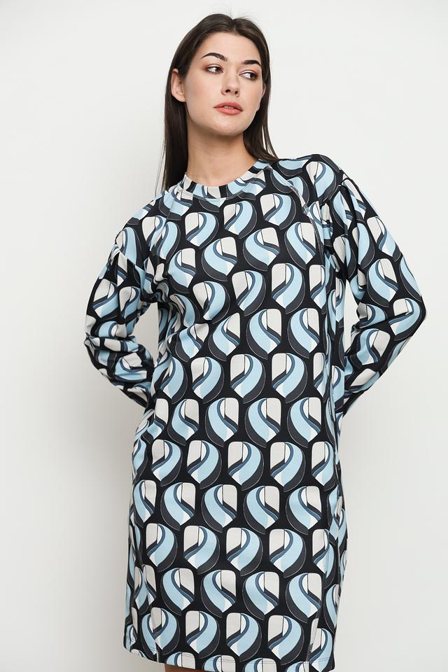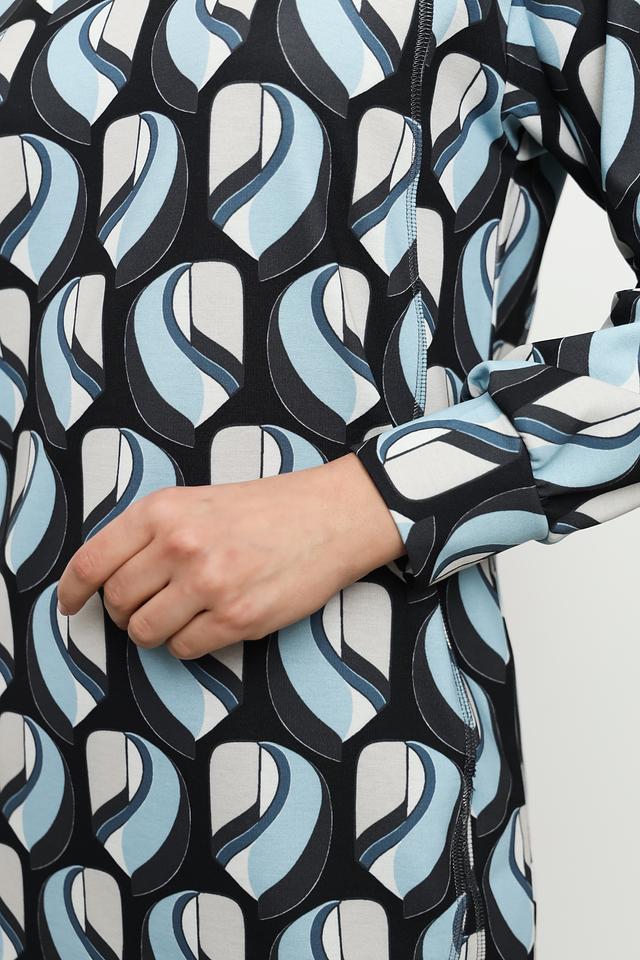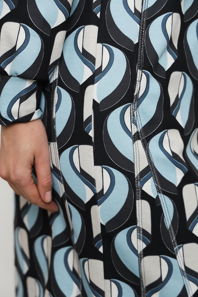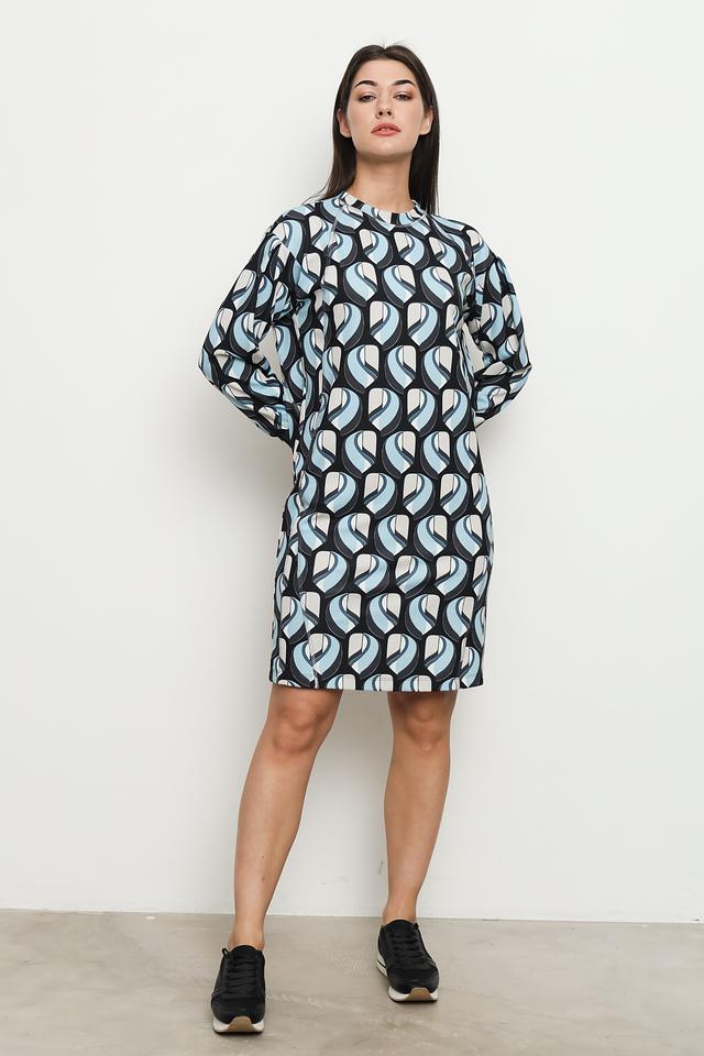 Платье Lecomte черного и голубого цвета с оригинальным геометрическим принтом. Модель выполнена из мягкой ткани с добавлением хлопка и эластана, что обеспечивает комфорт в носке и свободу движений. Состав: полиэстер 65%, хлопок 30%, эластан 5%