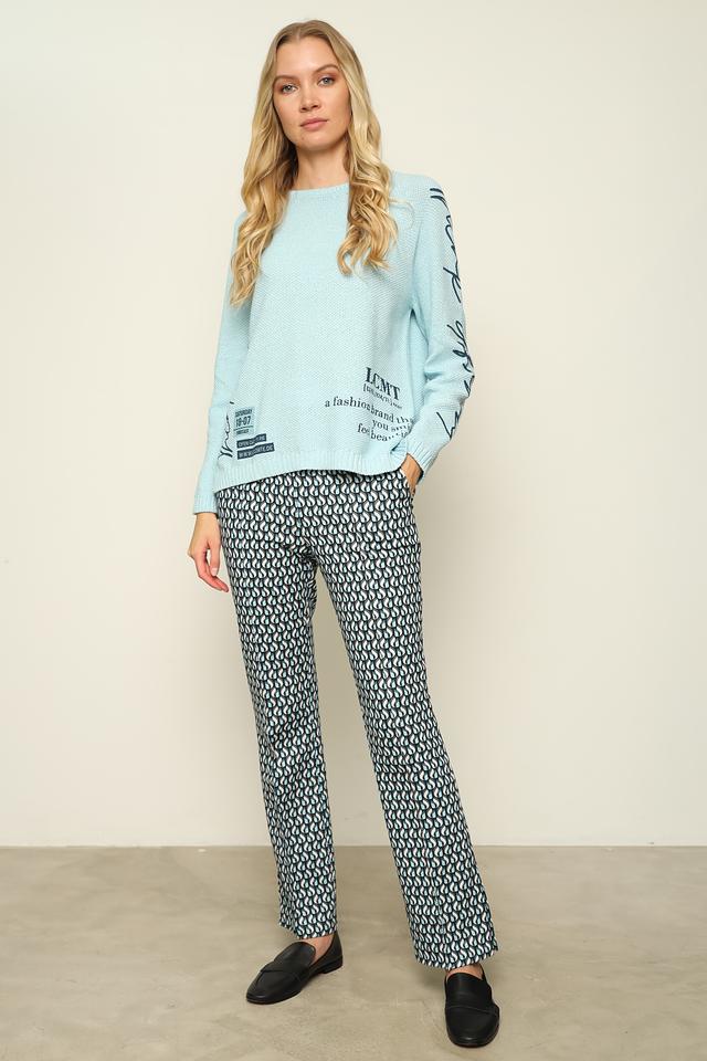 Особенностью модели является оригинальный принт с надписями и графическими элементами, который добавляет образу индивидуальности. Пуловер имеет классический крой с длинными рукавами и круглым вырезом горловины.