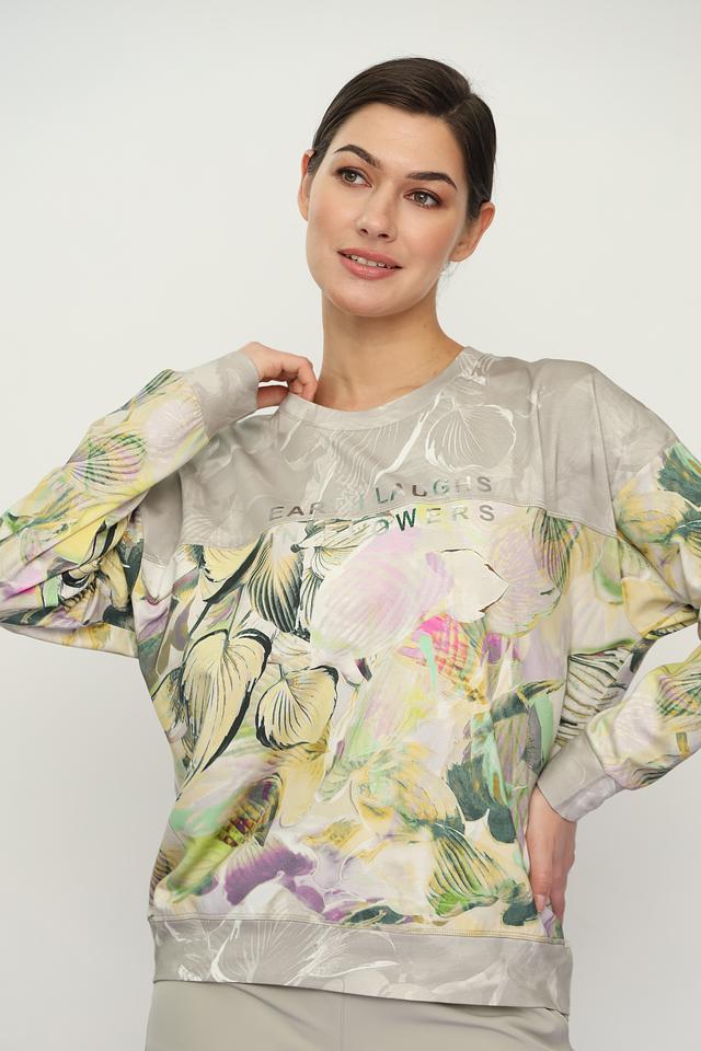 Пуловер имеет свободный крой и круглый вырез горловины. Главная особенность модели – яркий и красочный цветочный принт, который добавляет образу легкости и свежести. Принт выполнен в пастельных тонах с преобладанием зелёного, жёлтого и розового цветов.