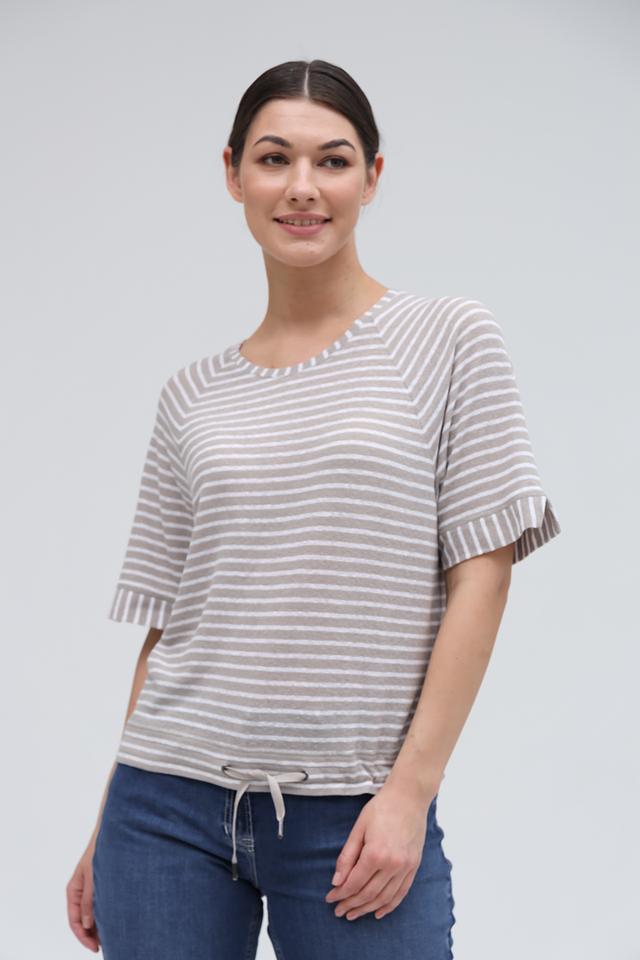 Женский пуловер Lecomte бежевого цвета в полоску с коротким рукавом и завязками по бокам. Изготовлен из натурального хлопка с добавлением льна и эластана для комфорта и удобства. Состав: хлопок 65%, лен 30%, эластан 5%