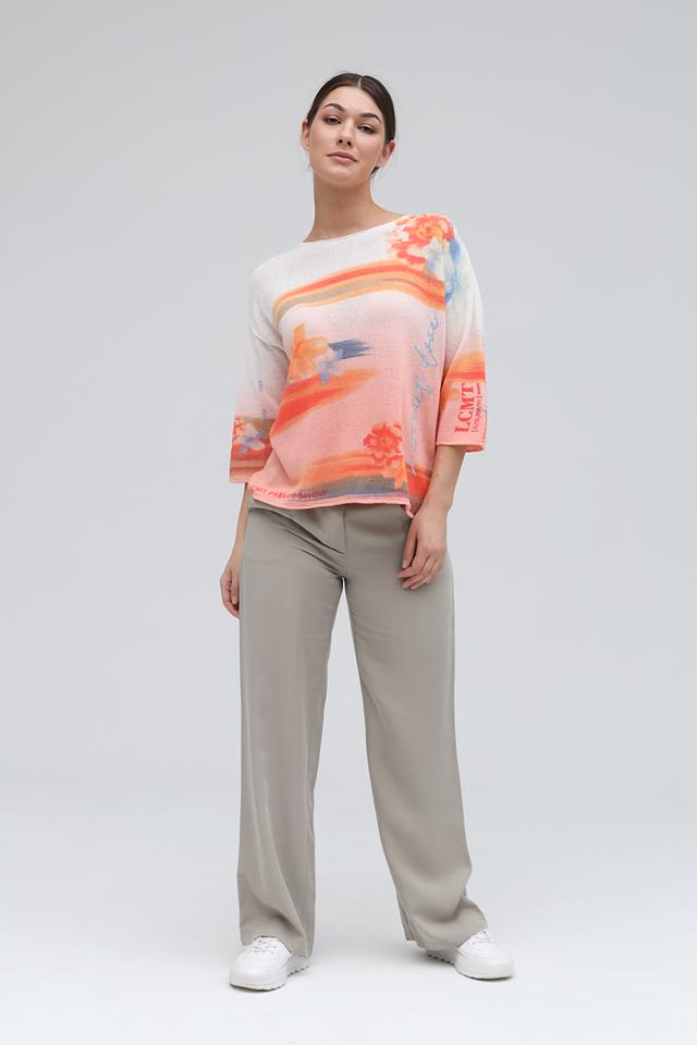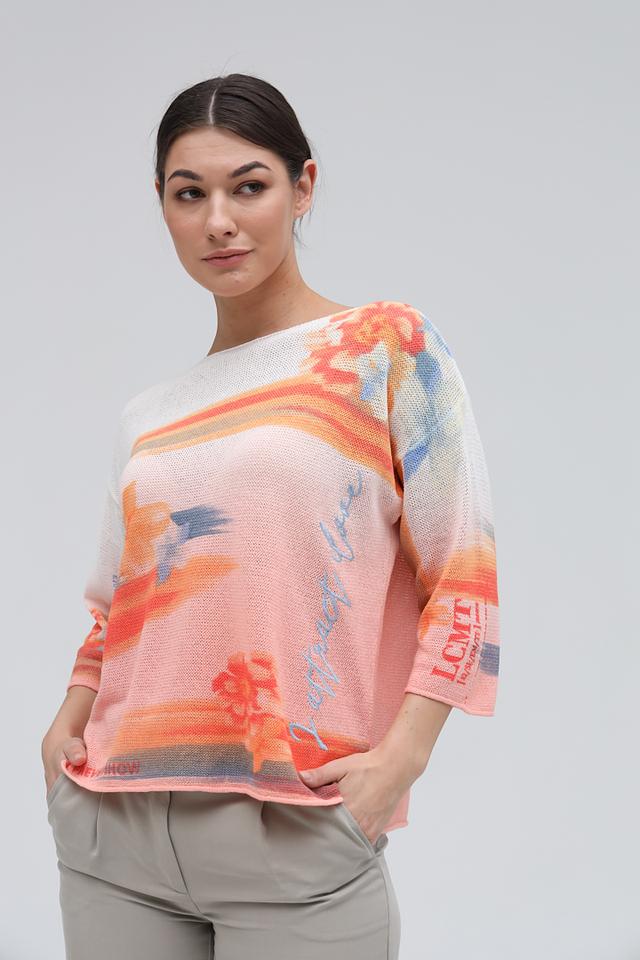 Этот стильный джемпер от Lecomte станет ярким акцентом вашего образа. Модель выполнена в нежном персиковом цвете и украшена оригинальным абстрактным принтом, сочетающим в себе оранжевые, голубые и белые оттенки.