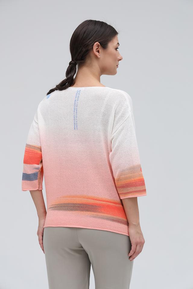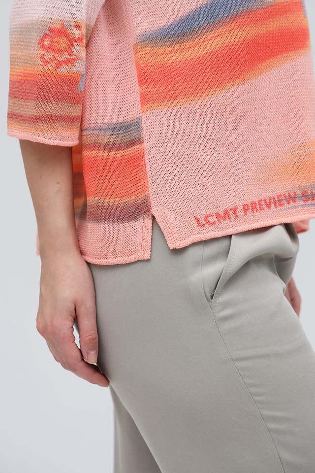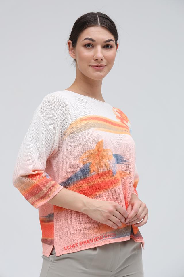 Женский джемпер Lecomte персикового цвета с ярким абстрактным принтом и короткими рукавами. Изготовлен из мягкого сочетания хлопка, льна и полиамида, обеспечивающего комфорт и удобство в носке. Состав: хлопок 61%, лен 21%, полиамид 18%